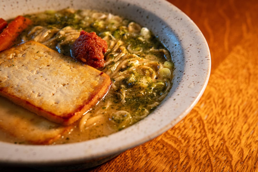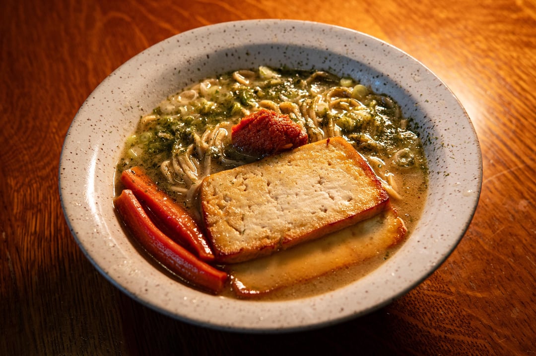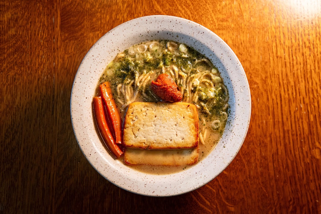 Topped with red braised tofu (amazing), carrot tsuekemono, aonori and scallion whites.