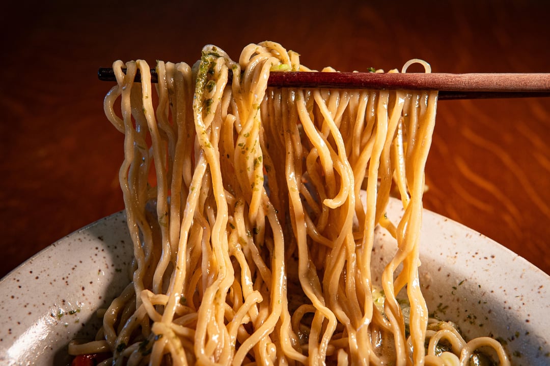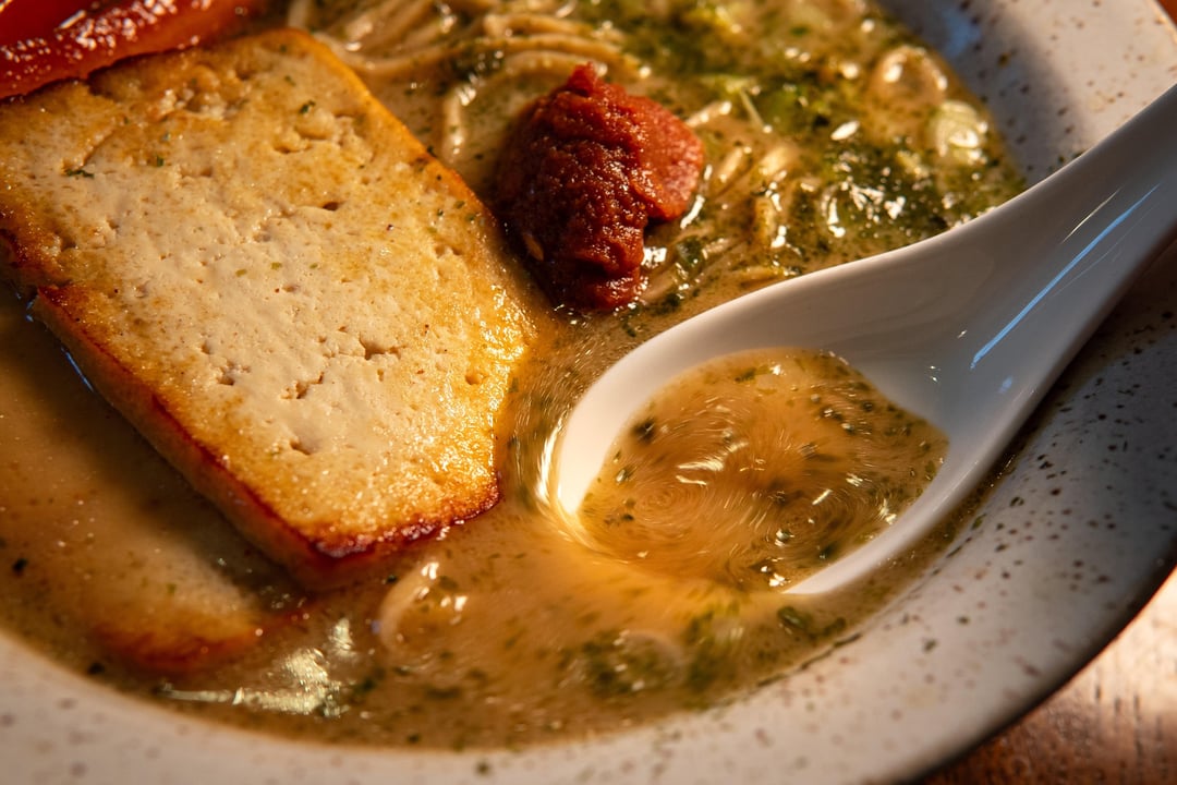 The broth was inspired by Food 52’s garlic stock recipe (sans the salt), but I added 3 tbsp of shortening, 3 large shiitake mushrooms, and msg. After boiling for an hour as directed to soften the garlic and extract flavors, I hit it with an immersion blender. The broth had an absolutely beautiful garlic smell and luscious sheen from the shortening. Blending it all up gave the broth a healthy viscosity.