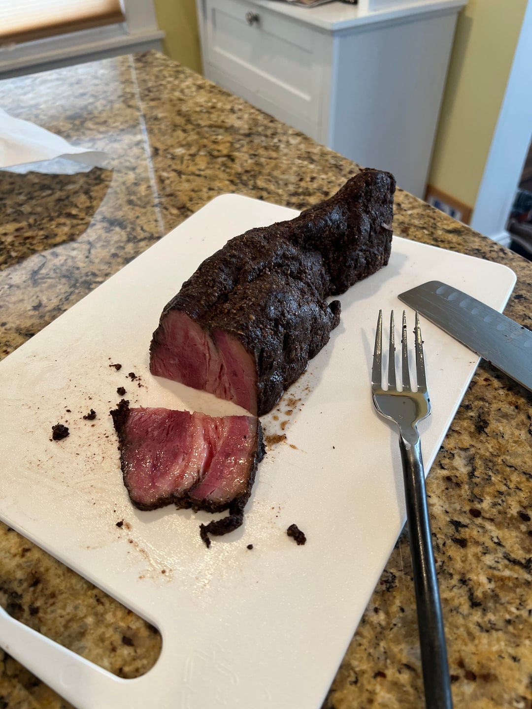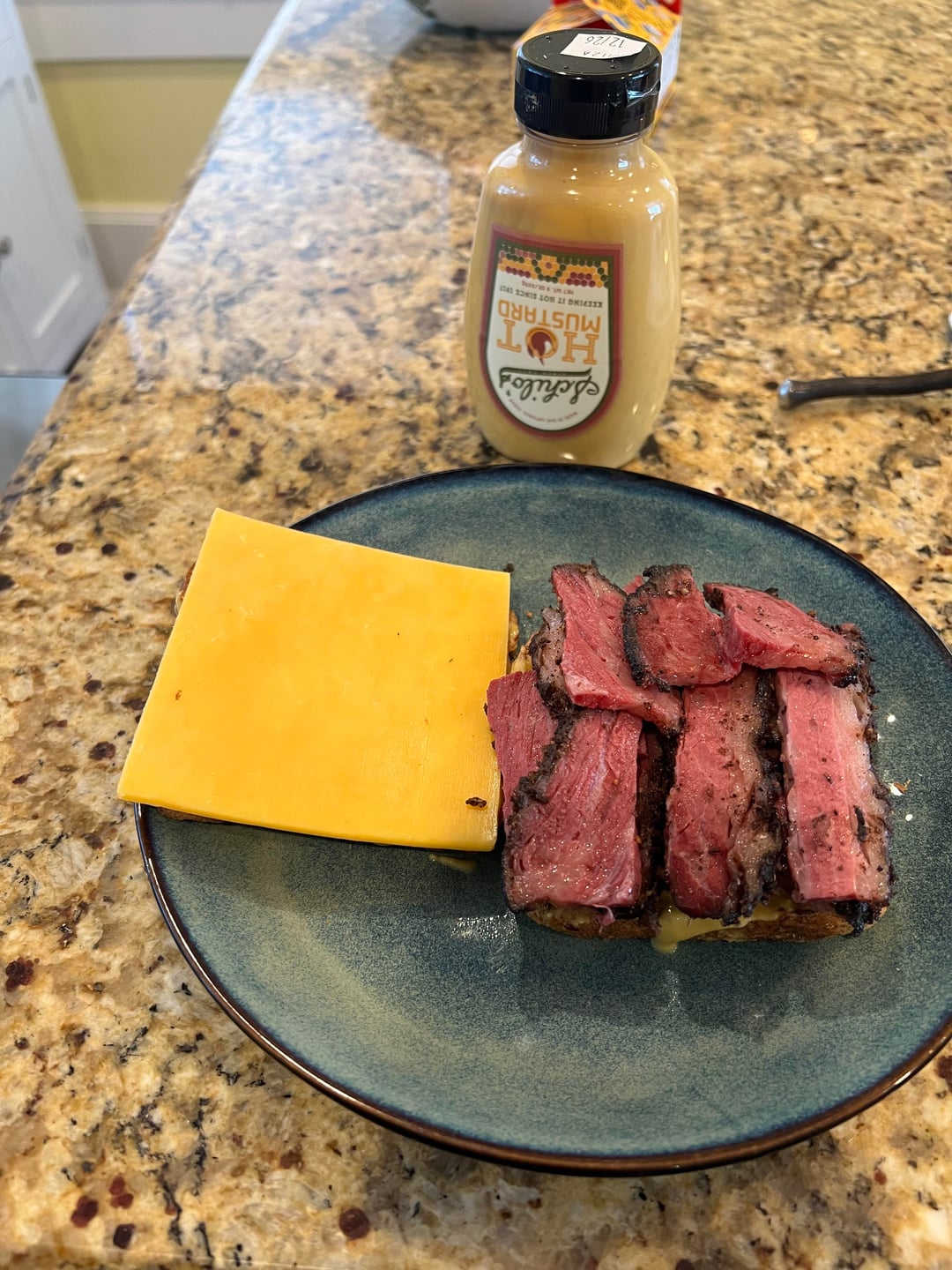 I bought a chunk of uncut pastrami from this great old Jewish deli today, Uncle Harry’s in Grosse Pointe Farms. They don’t sell it like this, the girl behind the counter first told me no, but the owner was right there and he was like, sure! Not the bread or cheese I would choose first, but still was great. Most places shave pastrami thin, I wanted to try it like you see at those famous old places