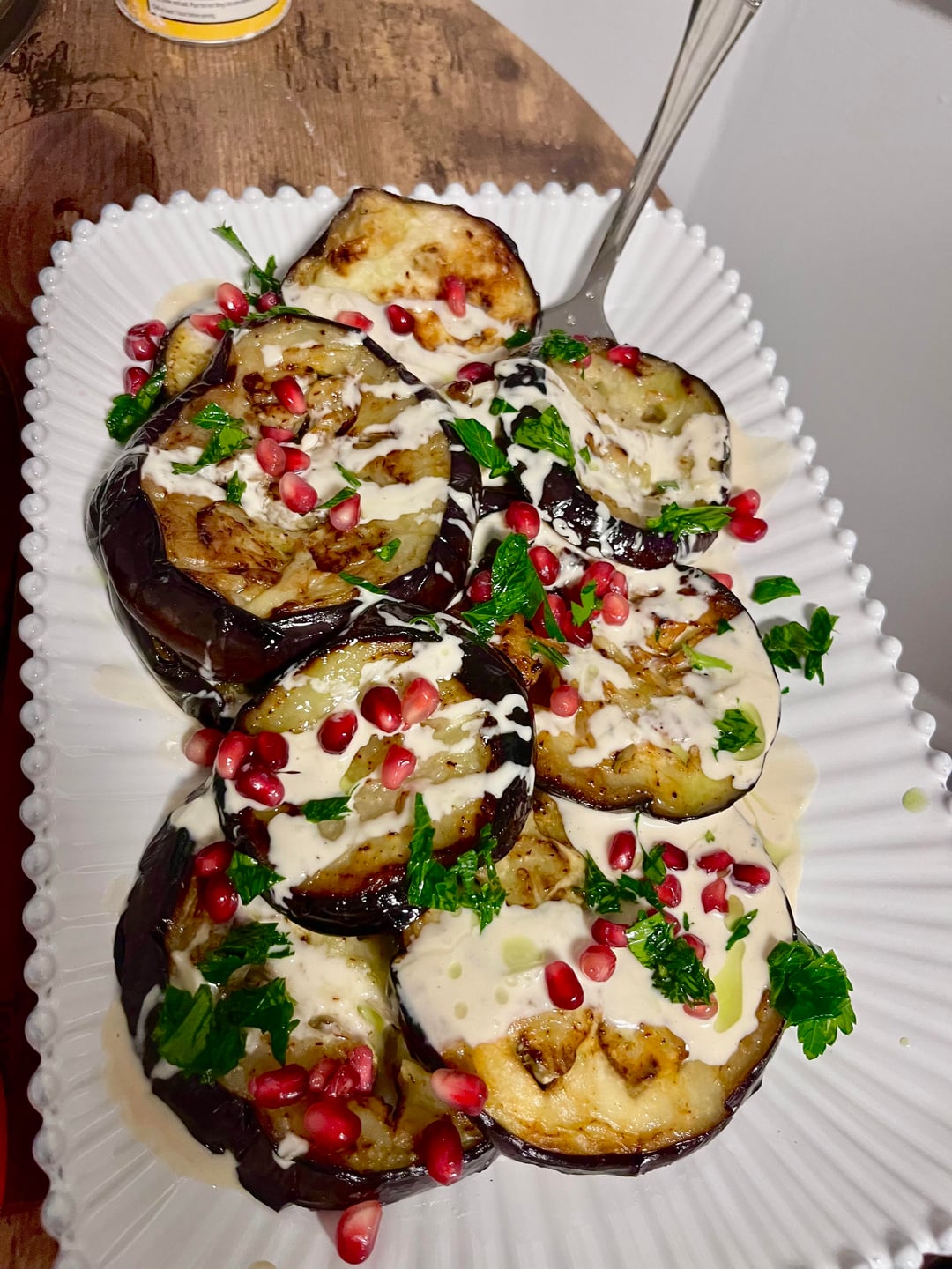 – Fried Eggplant with Tahini Dressing, Chive Oil & Pomegranates