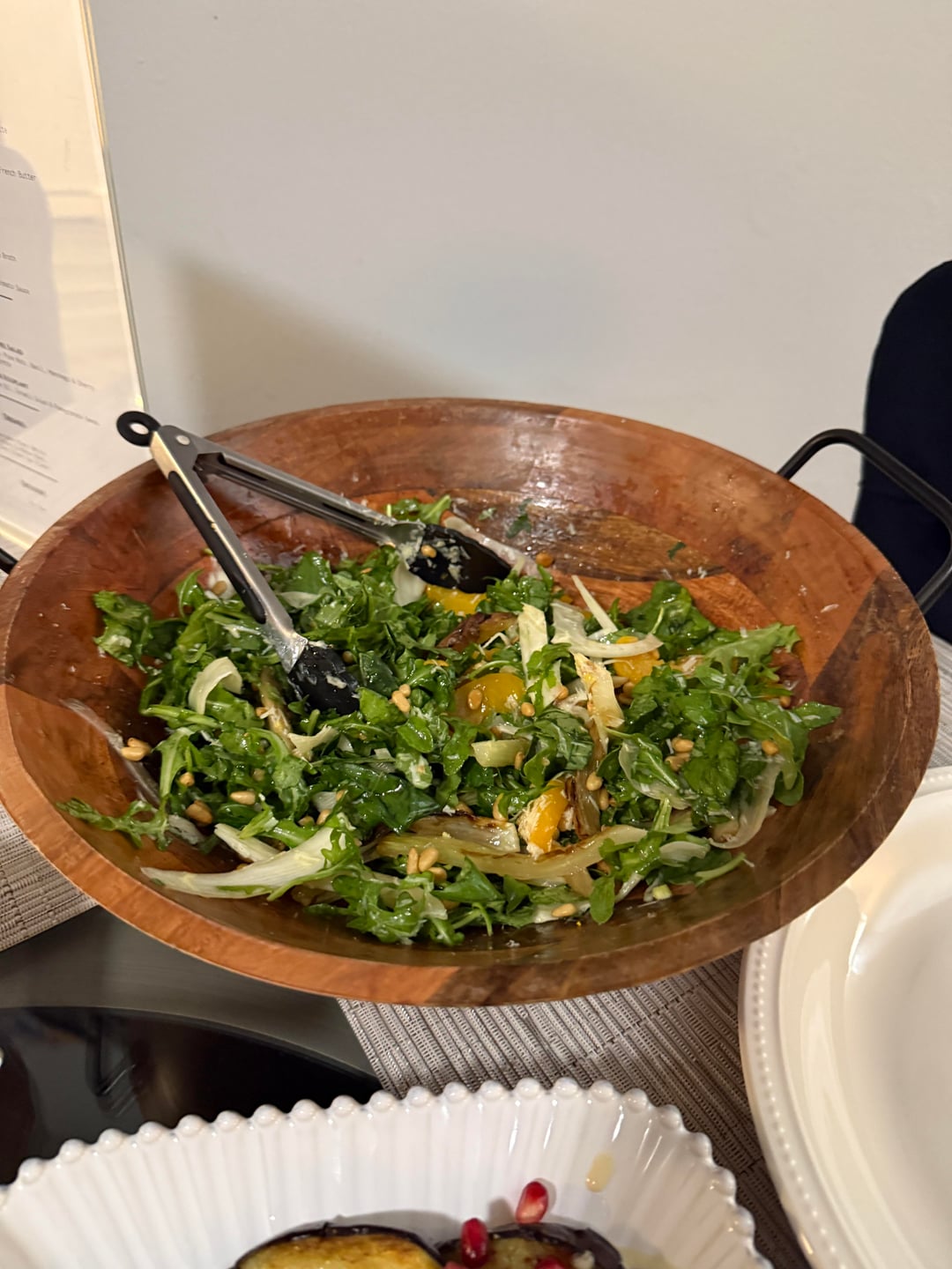 – Charred Fennel Salad with Arugula, Charred & Shaved Fennel, Peaches, Basil & Toasted Pine Nuts in a Sherry Vinaigrette