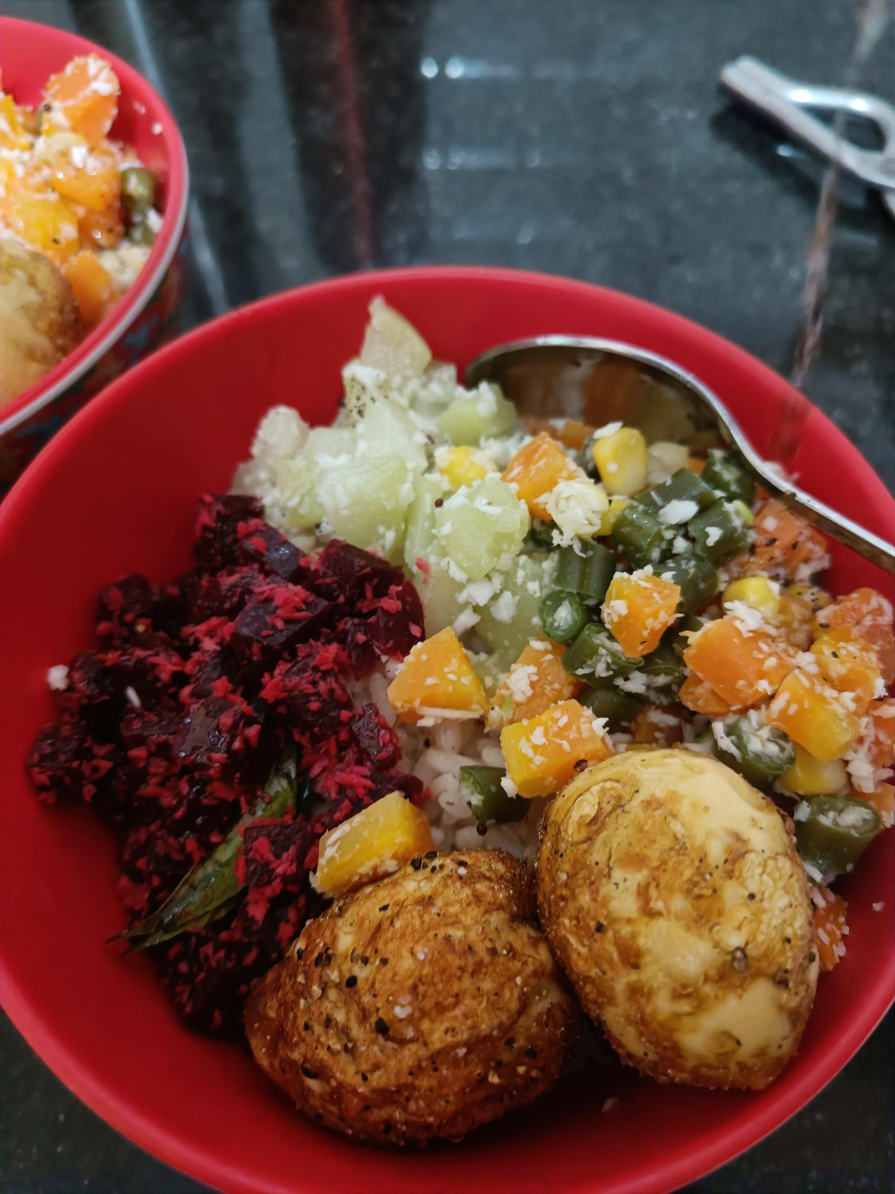 La estrategia del huevo frito nunca falla. Realmente es la mejor forma de mejorar un bowl de verduras. 10/10