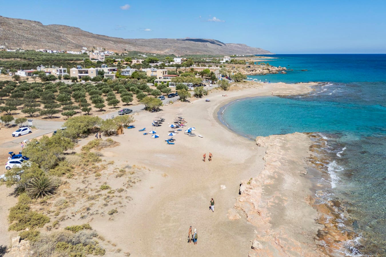 Aerial panoramic view from a drone of Xerokampos sandy beach with tourists and umbrellas next to an olive grove. An olive grove is an agricultural olive plantation, a cultivated area of olive trees grown for fruit or oil, characterized by a geometric planting layout. The trees are typically planted in a structured, geometric arrangement to optimize space for cultivation and harvesting with the primary purpose to produce olives, which are then used for making olive oil or are consumed as table olives. Creta island in the Mediterranean sea is famous for the high quality olive oil production, while Greece is one of the global producer and largest exporters along with Spain and Italy. Xerokampos, Crete island, Greece on October 7, 2025 (Photo by Nicolas Economou/NurPhoto via Getty Images)