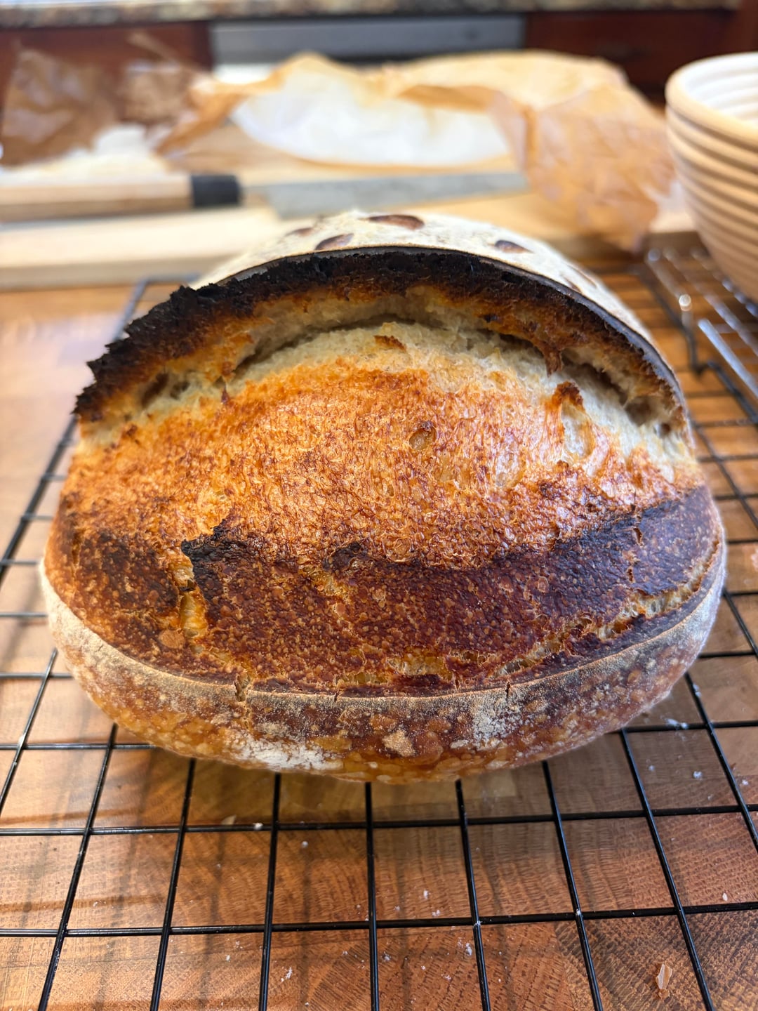 I’m still quite new to sourdough and after a string of flops I decided to ignore the clock for this loaf’s bulk fermentation and only went by appearance/feel. It’s definitely better than any of my recent loaves, but I’m wondering if it’s still leaning on the side of under proofed? Recipe and steps were:
