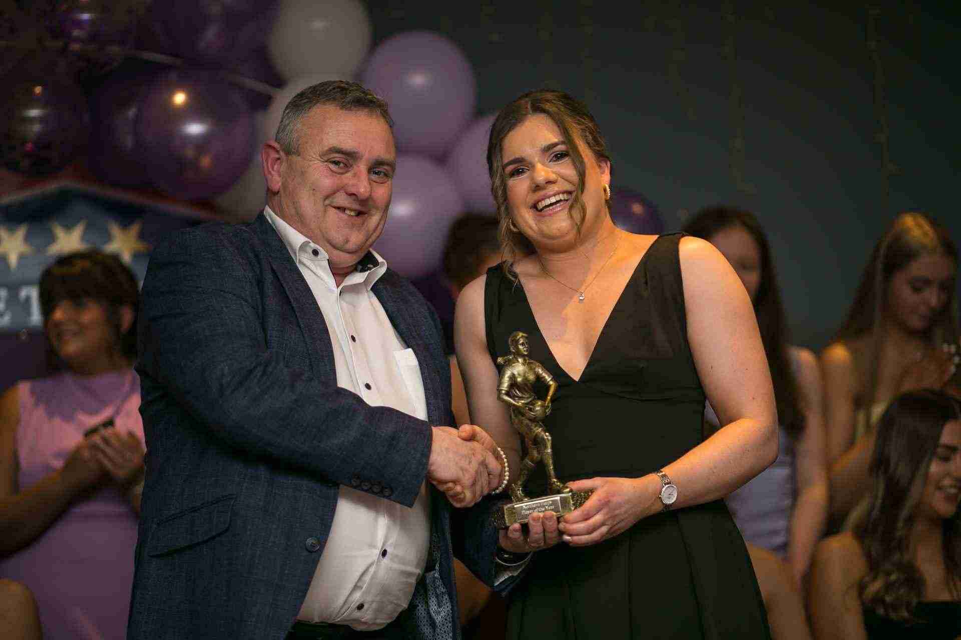 Player of the Year Anna McGrath receiving her award from Roscommon LGFA Chairperson Declan Walsh at the Northern Harps Dinner Dance in the Percy French Hotel, Strokestown. Photo: Michelle Hughes Walsh