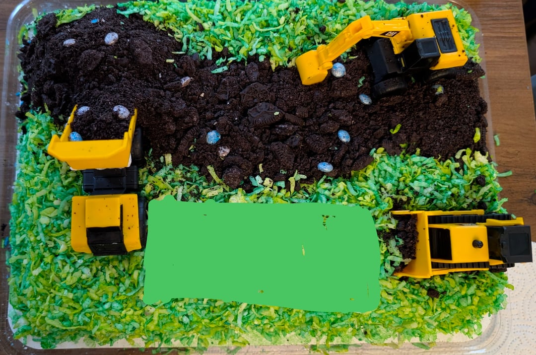 I dyed coconut for the grass and used oreos for the dirt. I used some of the big icing blobs I picked off to build a base for the pile of dirt. Then I used luster dust on mini M&Ms for the rocks! I probably still spent the $30 it would have cost me if I had ordered it on time. (Green block is to blur out my kids name lol)