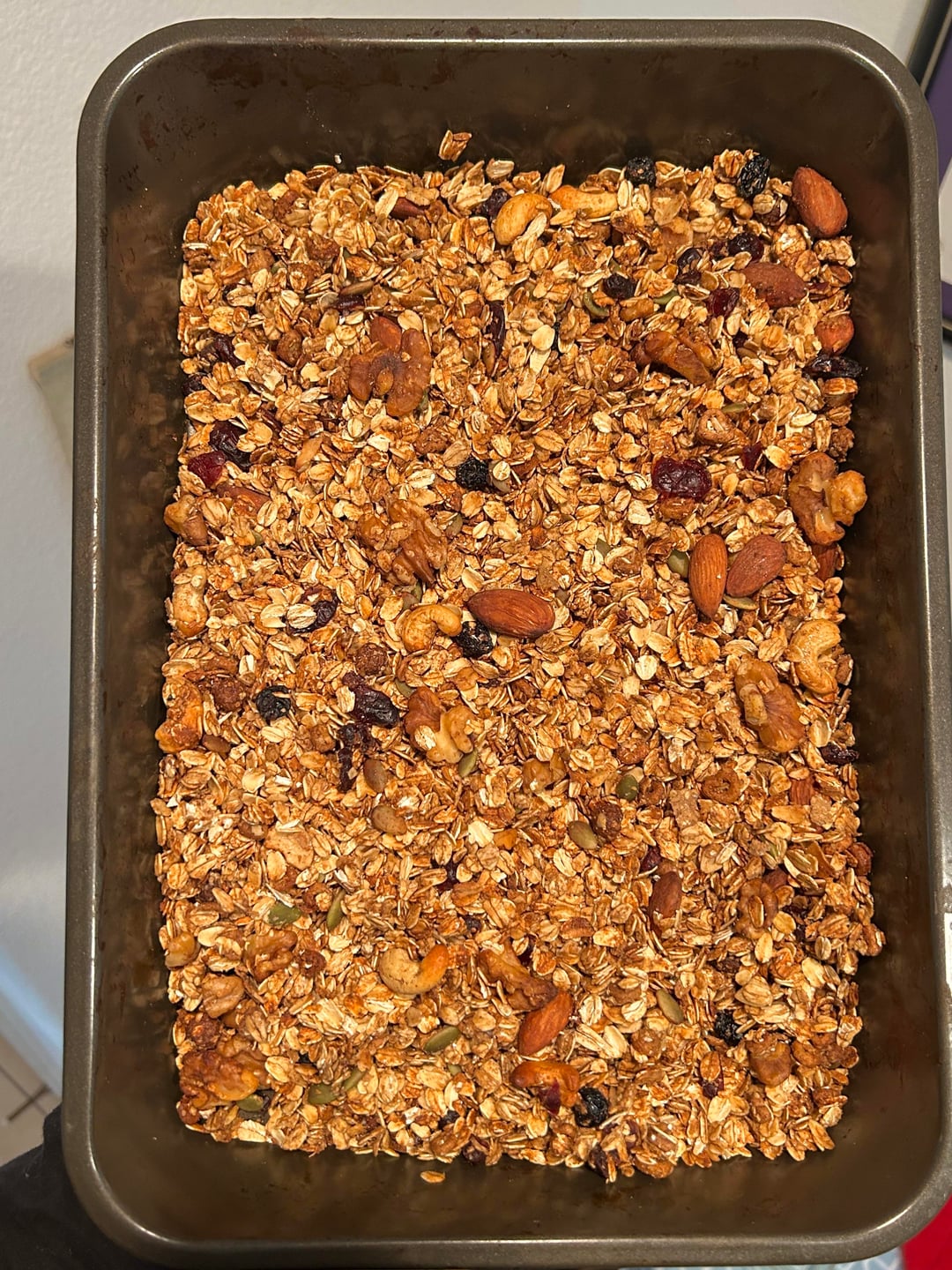 Homemade granola (old fashioned oats, honey, mixed nuts, pumpkin spice)