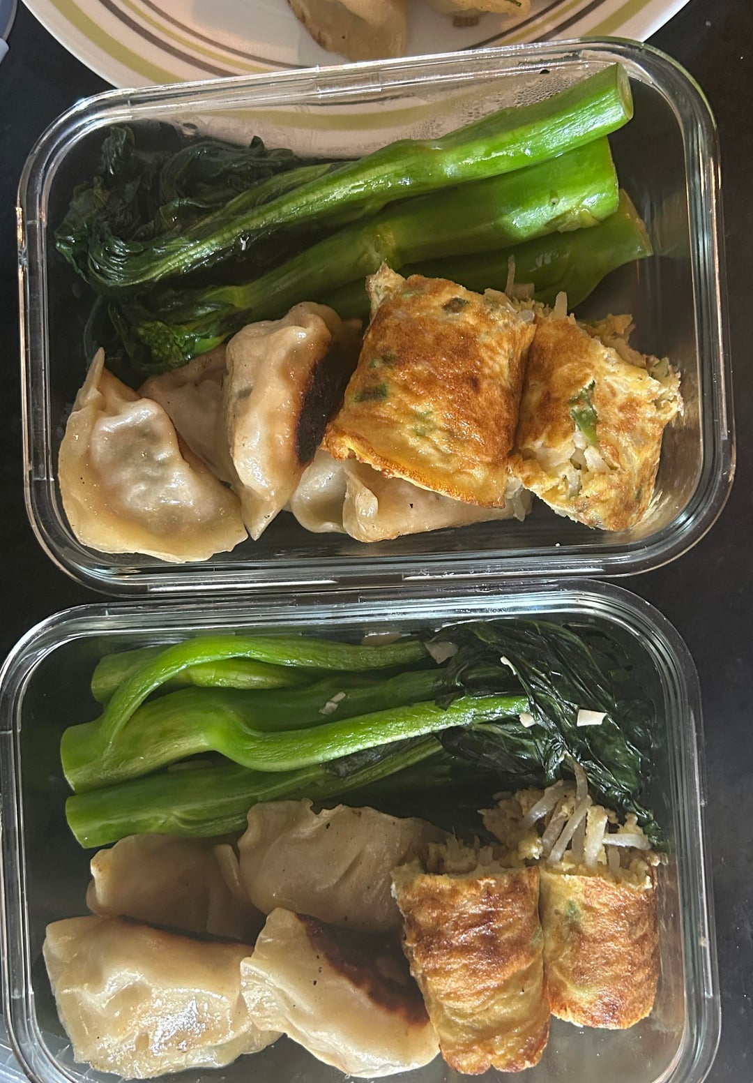 Dumplings, steamed Gai lan in sauce(oyster sauce, garlic, cornstarch) , egg foo young (eggs, bean sprouts, oyster sauce)