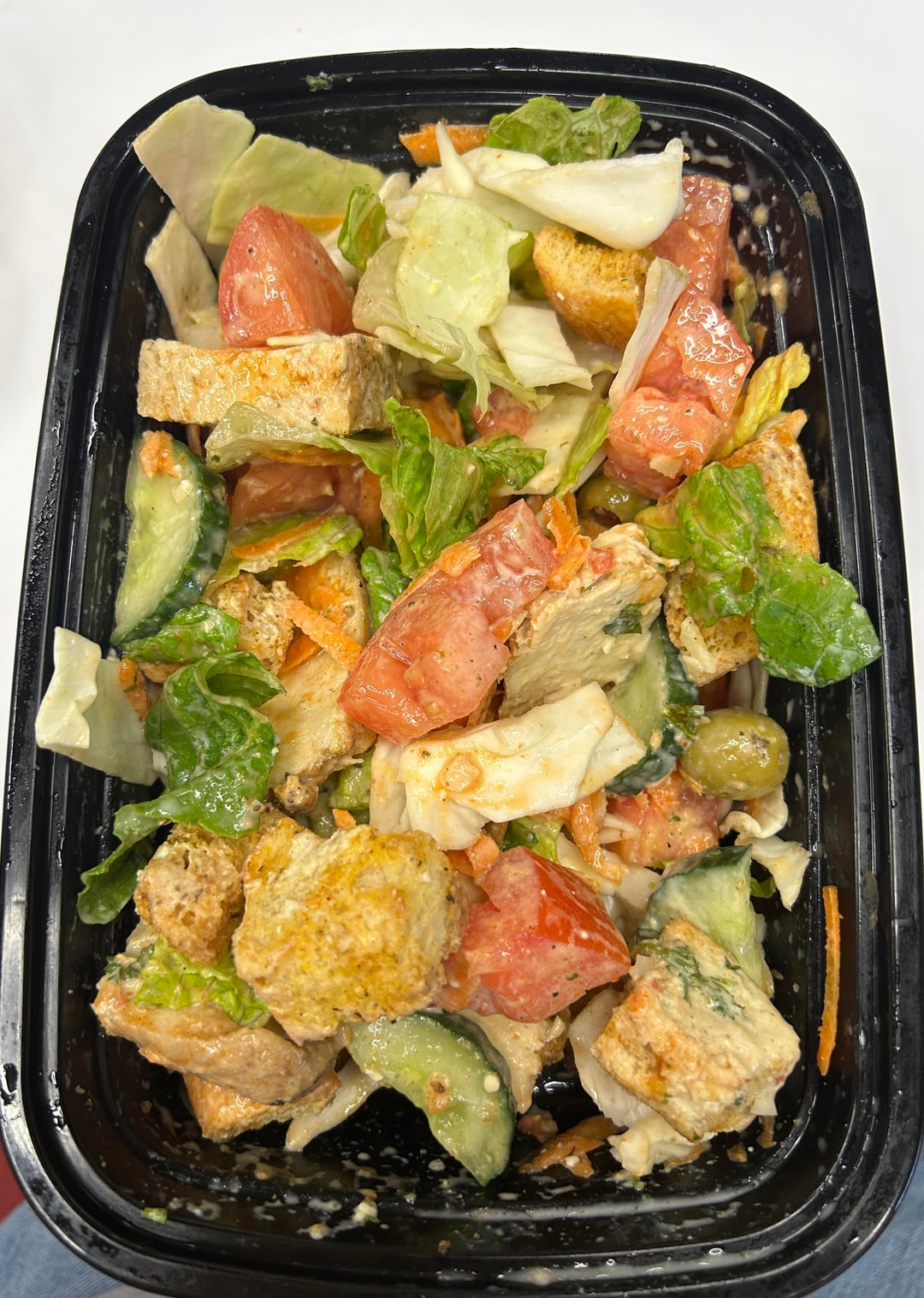 Chicken breast garden salad (grilled chicken, cabbage, carrots, tomatoes, lettuce, pickles, olives, croutons). Homemade dressing (Greek yogurt, Dijon, honey, parsley, red wine vinegar)