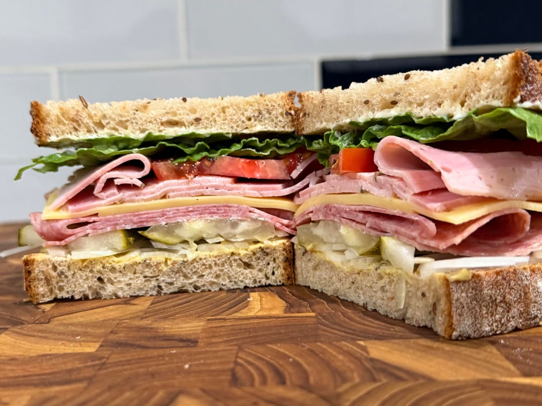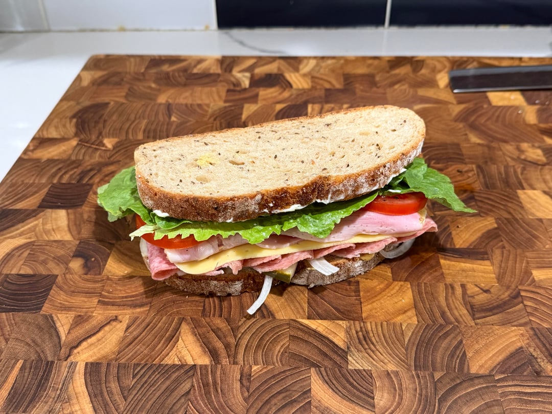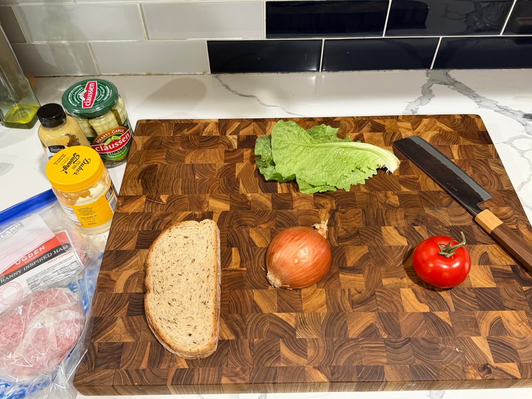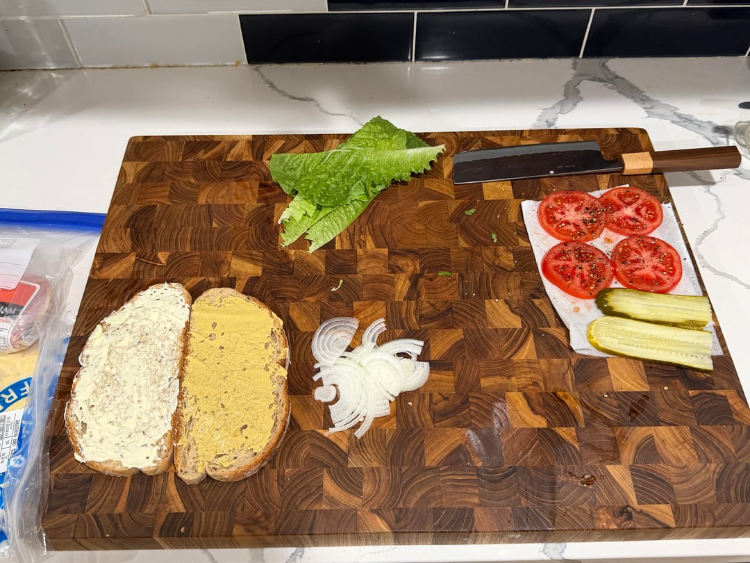 Hey that looks like a nicely maintained teak end-grain cutting board… possibly the exact same one that I have. Nicely done! Nice sandwich, too!