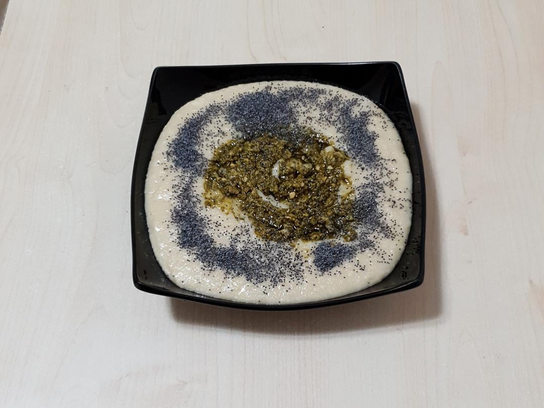 I used chicken broth, butter, panko breadcrumbs (probably would've been soupier with regular breadcrumbs), cheddar, Grana Padano, pesto and poppy seeds.