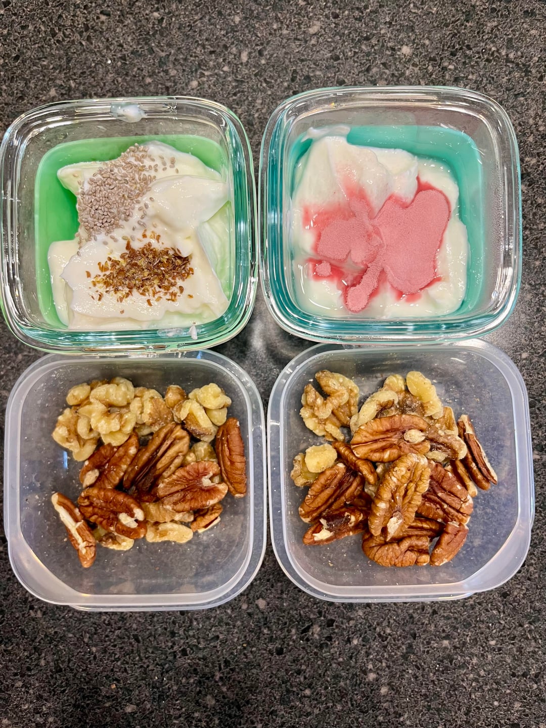 yogurt + pomegranate powder / grounded flax seeds + chia seeds.