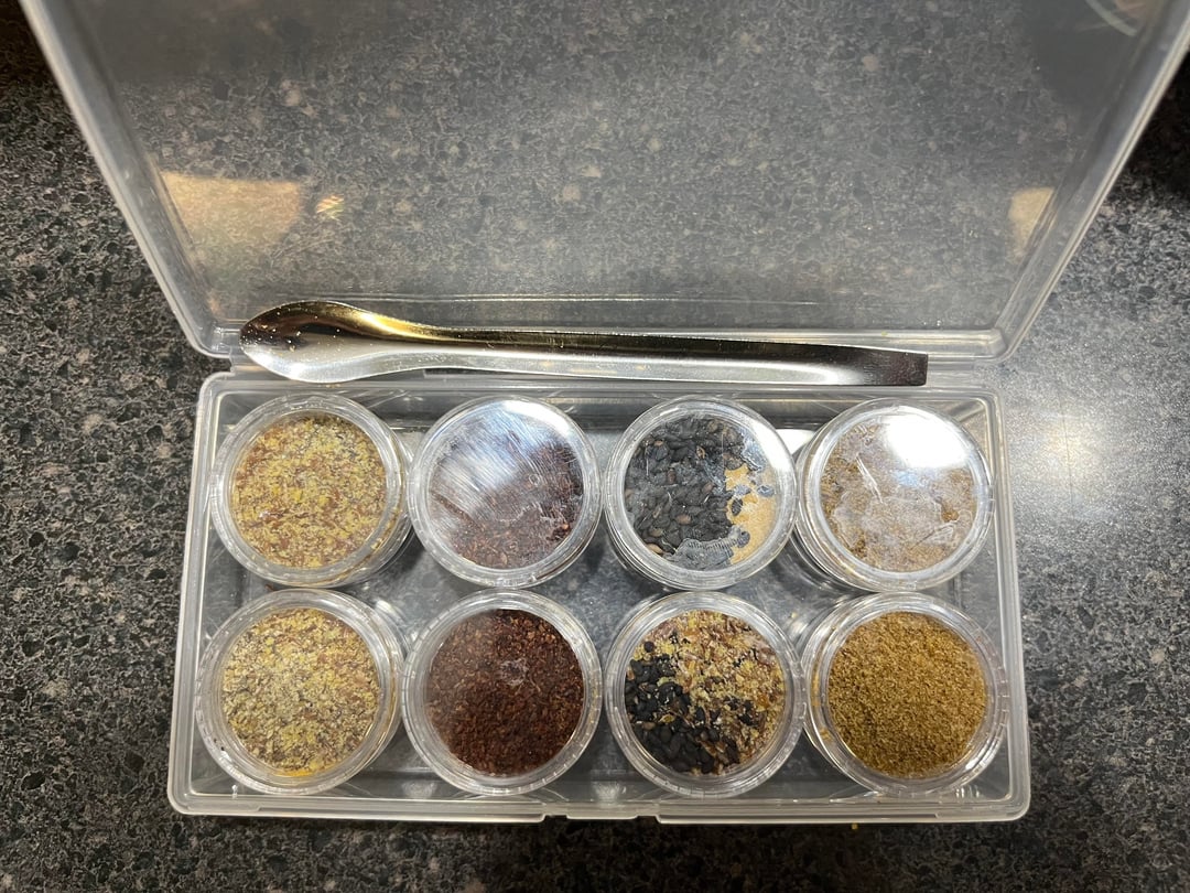 sumac + pepper, cumin, black sesame + garlic powder, grounded flax seeds