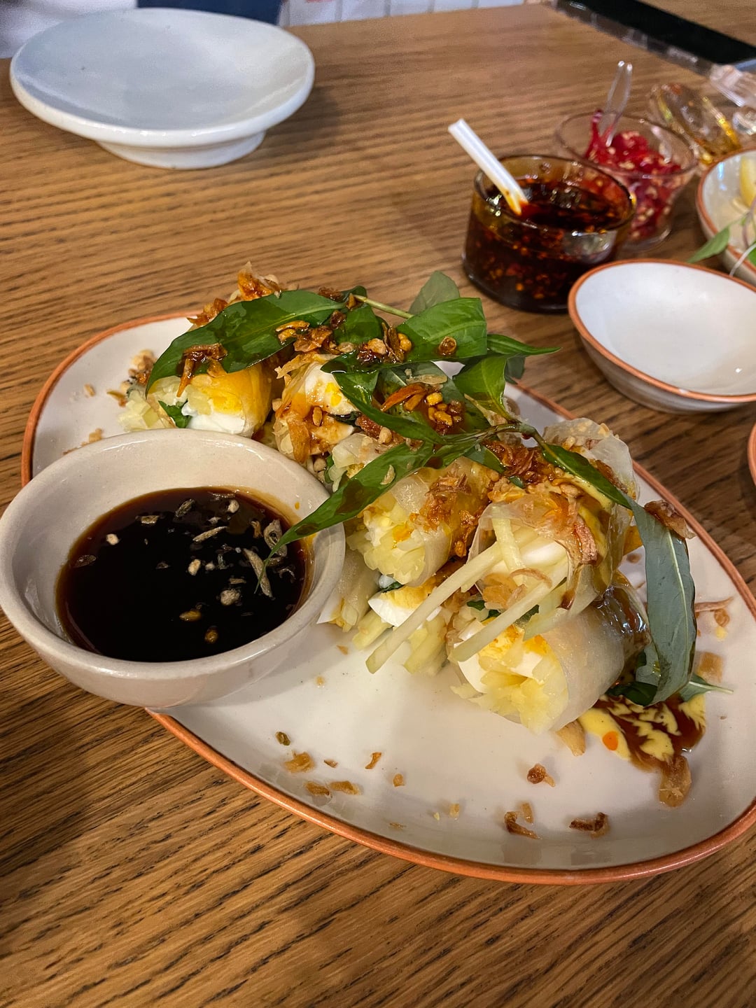 RICE PAPER ROLLS: I had 4 small pieces of them (equivalent to 2), only green mango and boiled egg inside (no noodles) but there was a thick sweet sauce on the side and the rolls were drizzled in fried shallots, and a sweet tamarind sauce.