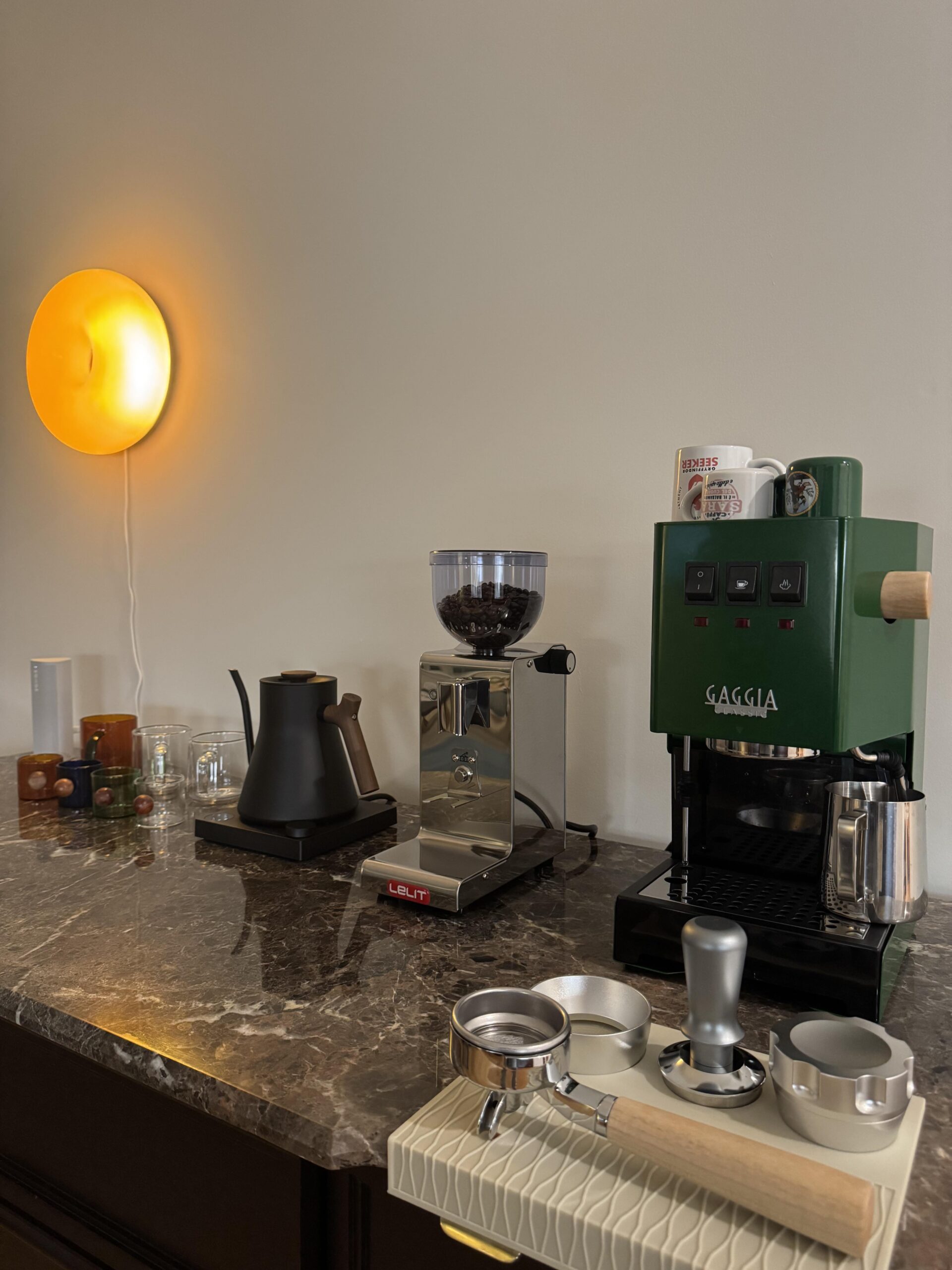 Now that we know it’s a LELIT, you can safely remove the red sticker. The cups may not be the ideal choice, though. Judging by their size on the countertop, you might consider a bottomless portafilter and perhaps a small mirror on each side offer better visibility for you and your partner (coffee is always better enjoyed together). Even though you have a nicely sized handle to work with, the machine seems to be positioned about 10-15 cm a bit too far back. That said, it’s an absolutely gorgeous machine.