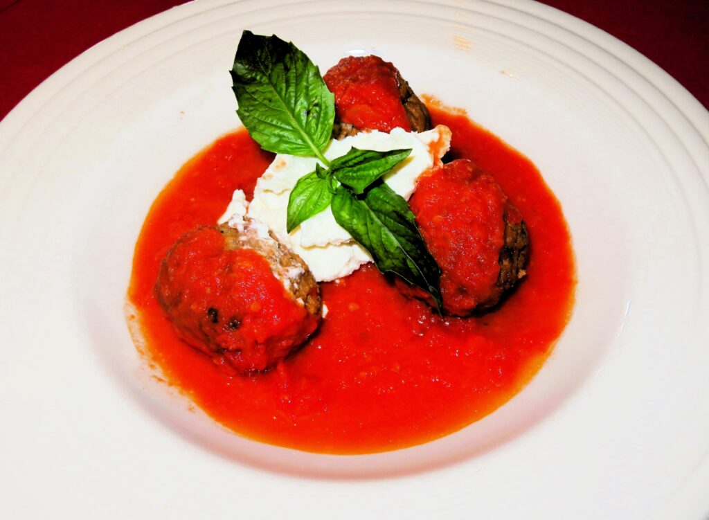 Smothered in tangy tomato sauce with ricotta cheese, the tender homemade meatballs are made with beef, veal, and pork.