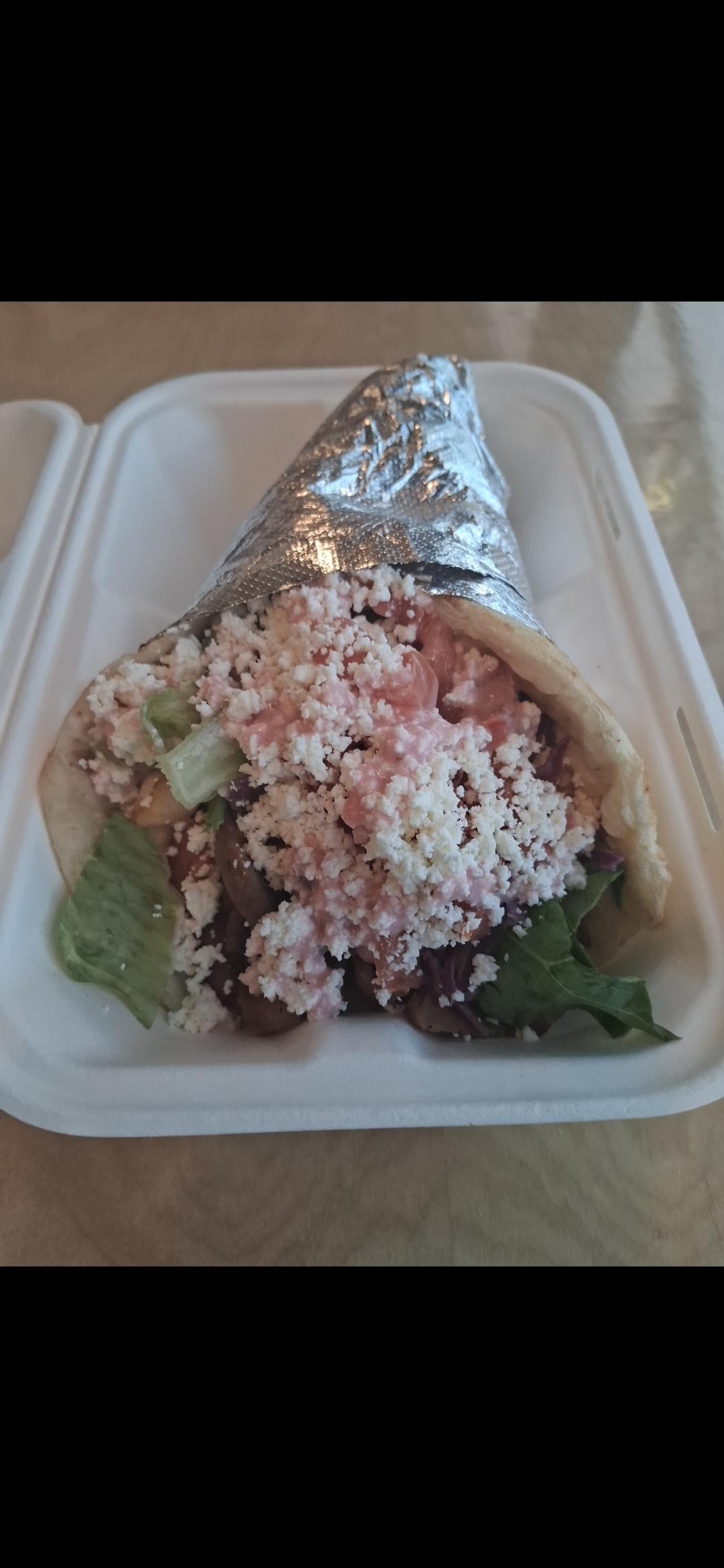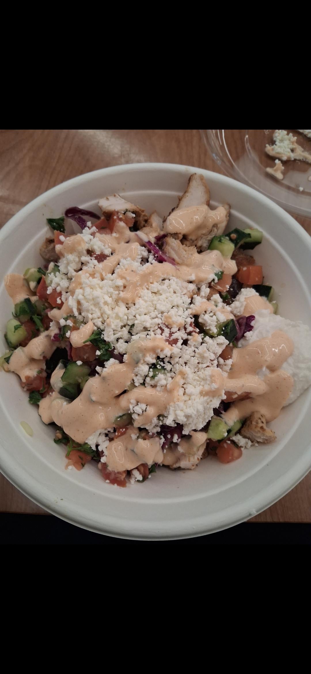 The downside to the gyro is the pita, it has fries in it, and it has lamb as protein. Upside is even though it is big, I think there is a lot more food in the bowl then here. Downside to the bowl is more food, more sauce. Upside is the protein is chicken. Technically this comes with lamb usually too but I opt for chicken. I don't like my gyro itself with chicken so thats why that has lamb.