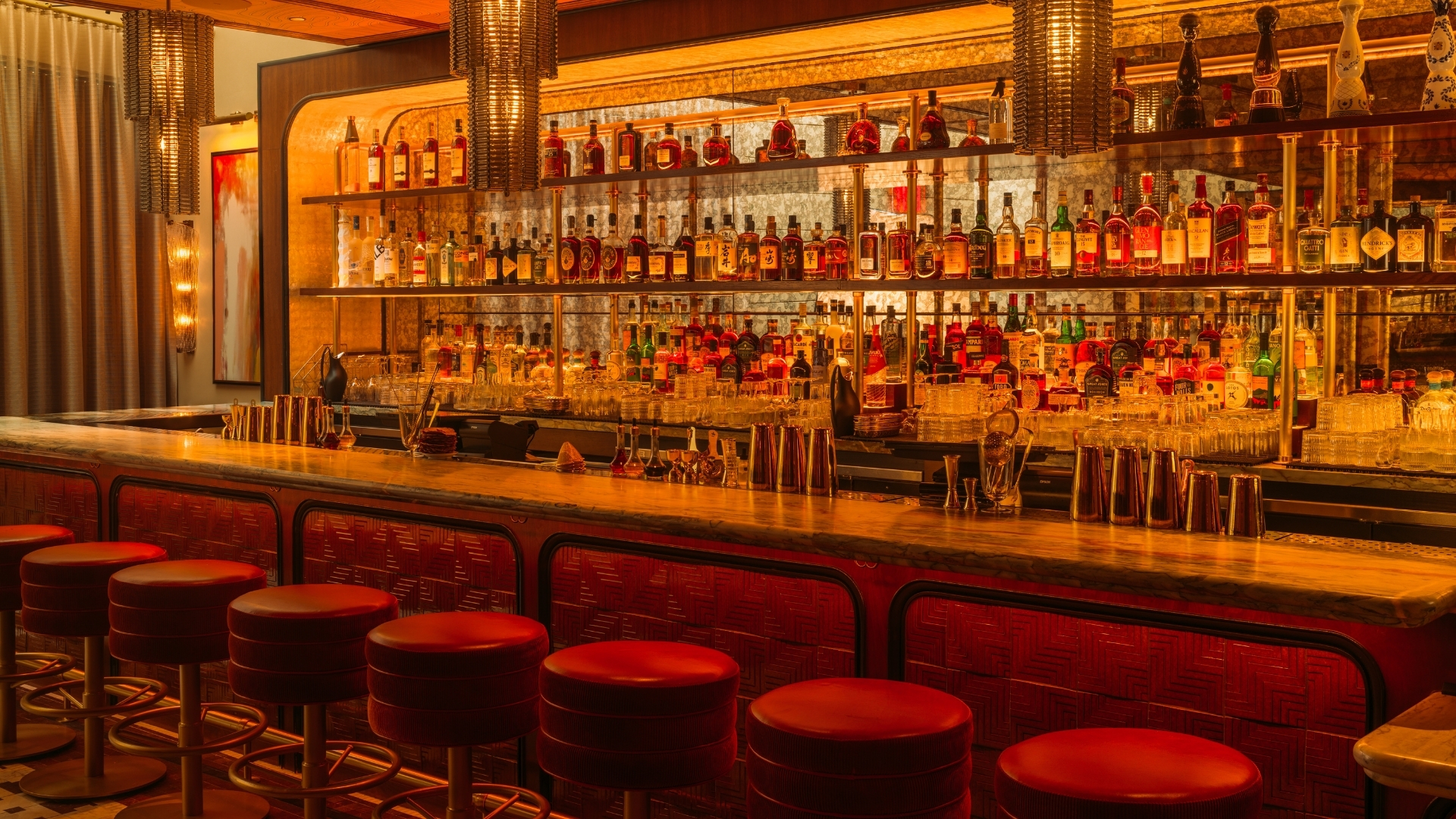 The 80-seat dining room, designed by Rockwell Group, leans into a saturated palette of oxblood, amber, and polished wood, anchored by a coal-fired open kitchen that keeps the culinary focus visible. Crimson banquettes curve around marble-topped tables, sculptural glass chandeliers cast layered light overhead, and the marble bar glows against backlit shelving lined with bottles. The effect is intimate and moody, unmistakably downtown after dark.