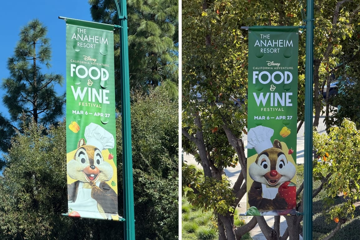 Street banners advertising the 2026 Disney California Adventure Food & Wine Festival have appeared on streetlights around the Disneyland Resort.