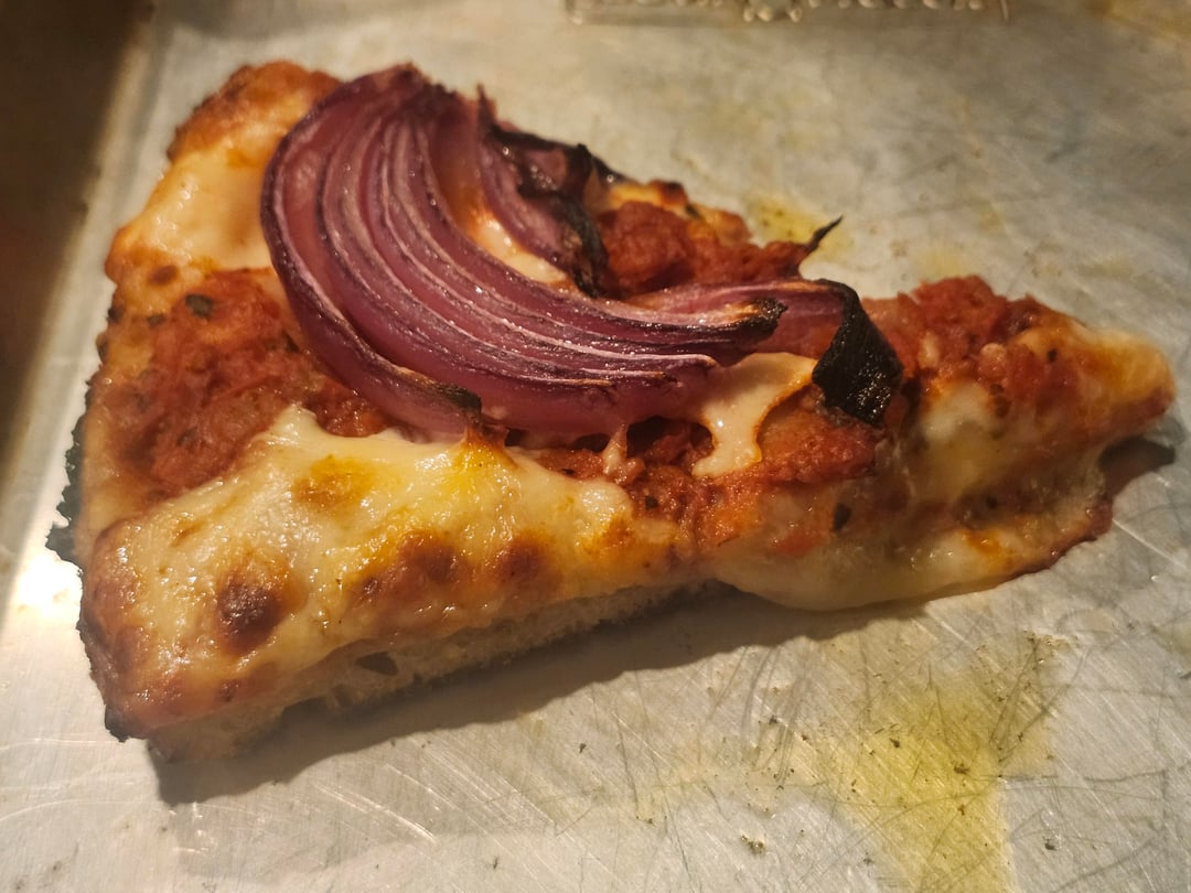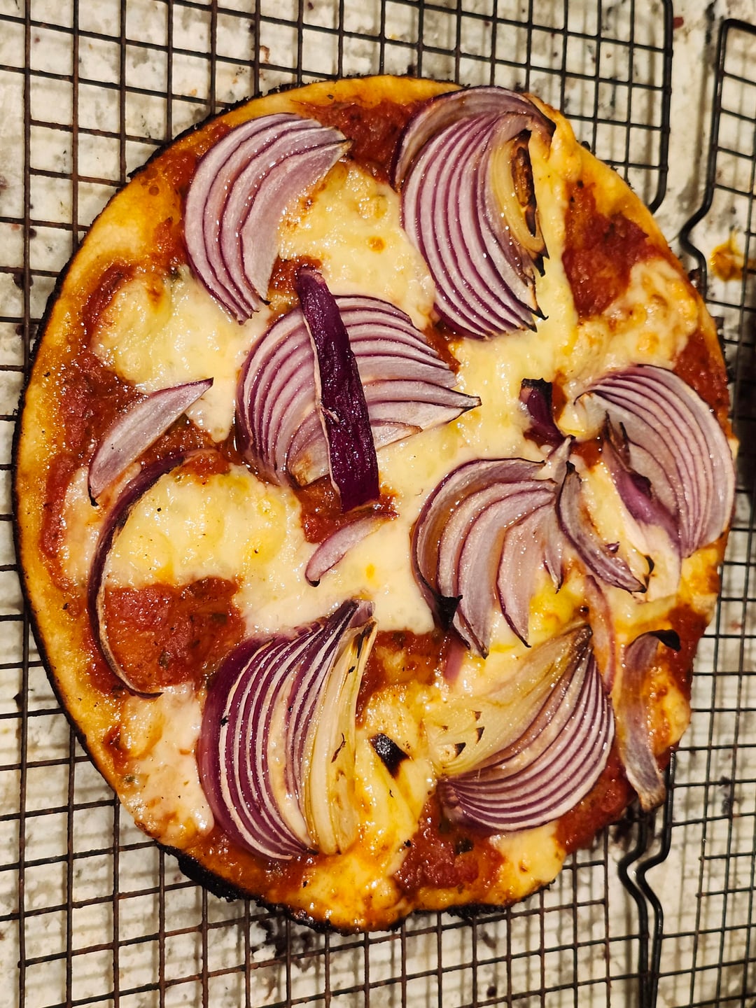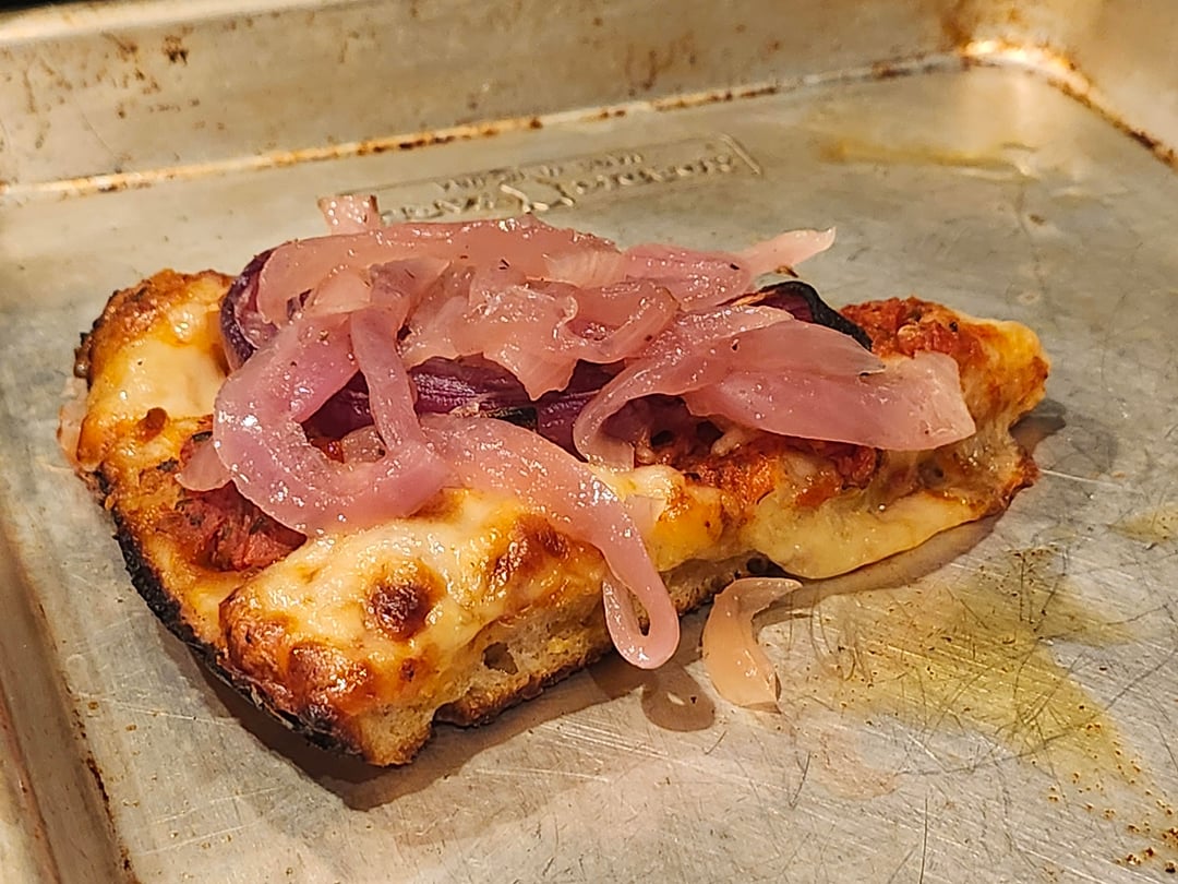Sourdough pizza dough, homemade marinara sauce, store brand cheese, thick wedges of red onions, and homemade lightly fermented pickled onions (https://www.reddit.com/r/OnionLovers/comments/1radiim/agrodolce_onion_marmalade/)