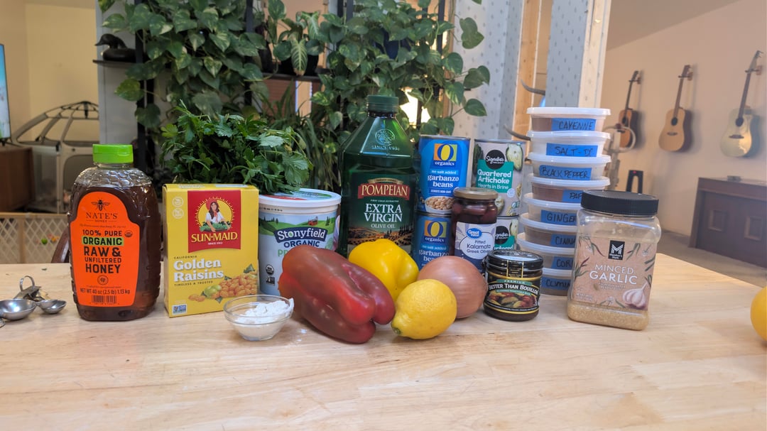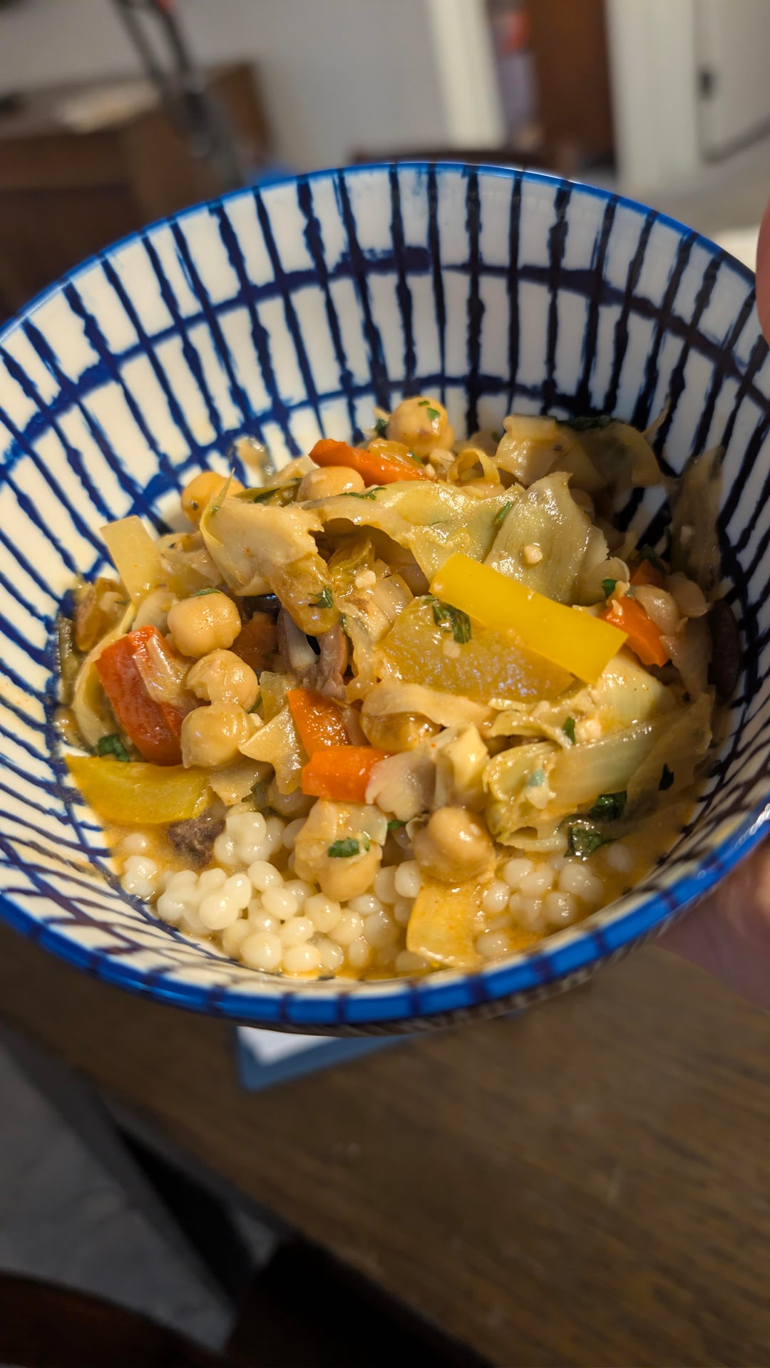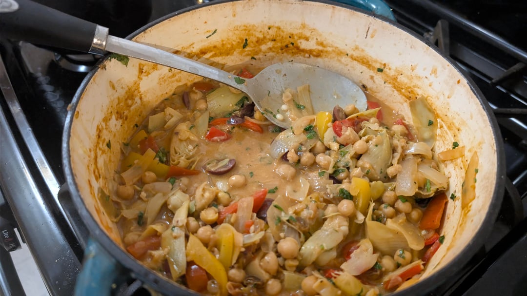 . This was delicious! It made so much food. Will be eating for dinner, lunch and dinner! I used canned artichokes, and they worked out great. Served it over large pearled couscous. Pictures of ingredients, in the pot, in the bowl and leftover.