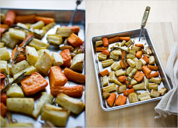 - Preheat the oven to 425ºF. Oil a sheet pan or a baking dish large enough to fit all of the vegetables in a single layer. Cut the carrots and parsnips into 3-inch lengths. Quarter the fat lengths, and cut the thin ends into halves so that the pieces are about the same size. Cut away the cores from the parsnips. Toss with the garlic, salt, pepper, rosemary sprigs, and olive oil until all of the vegetables are coated with oil.