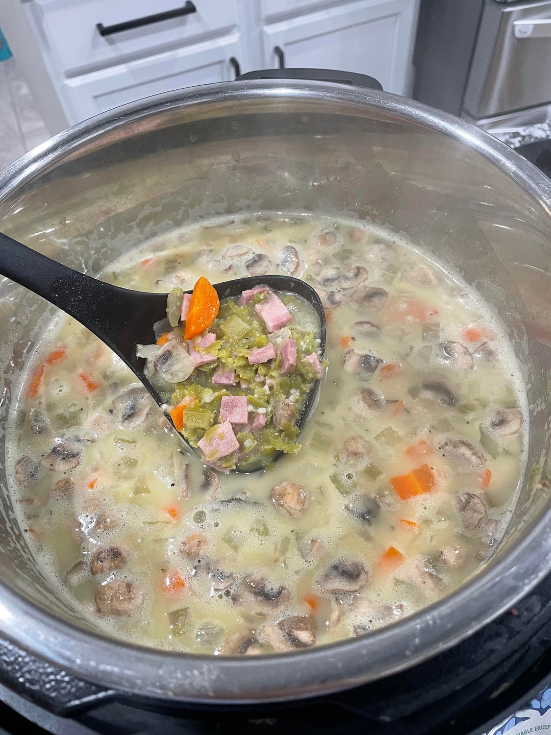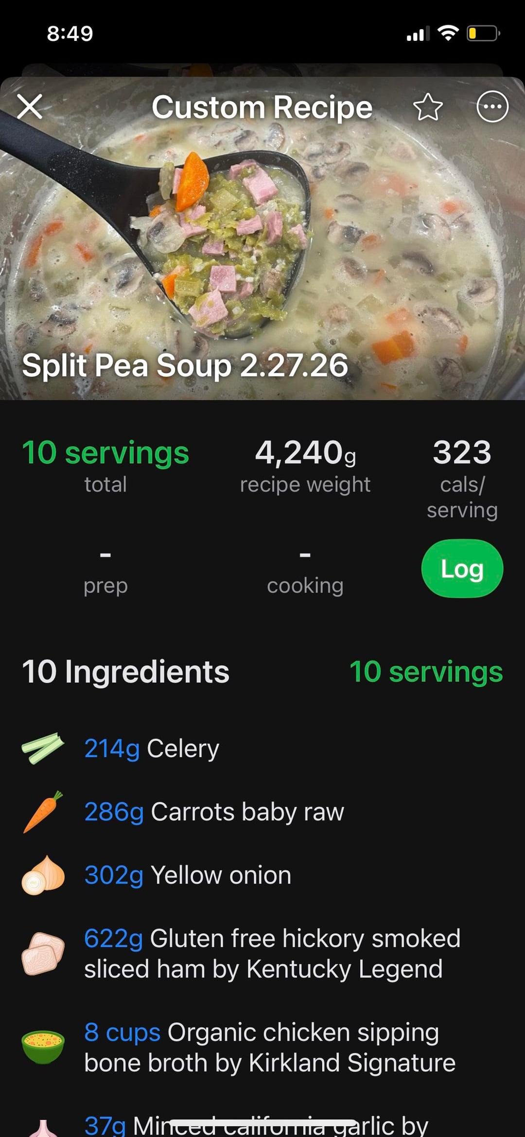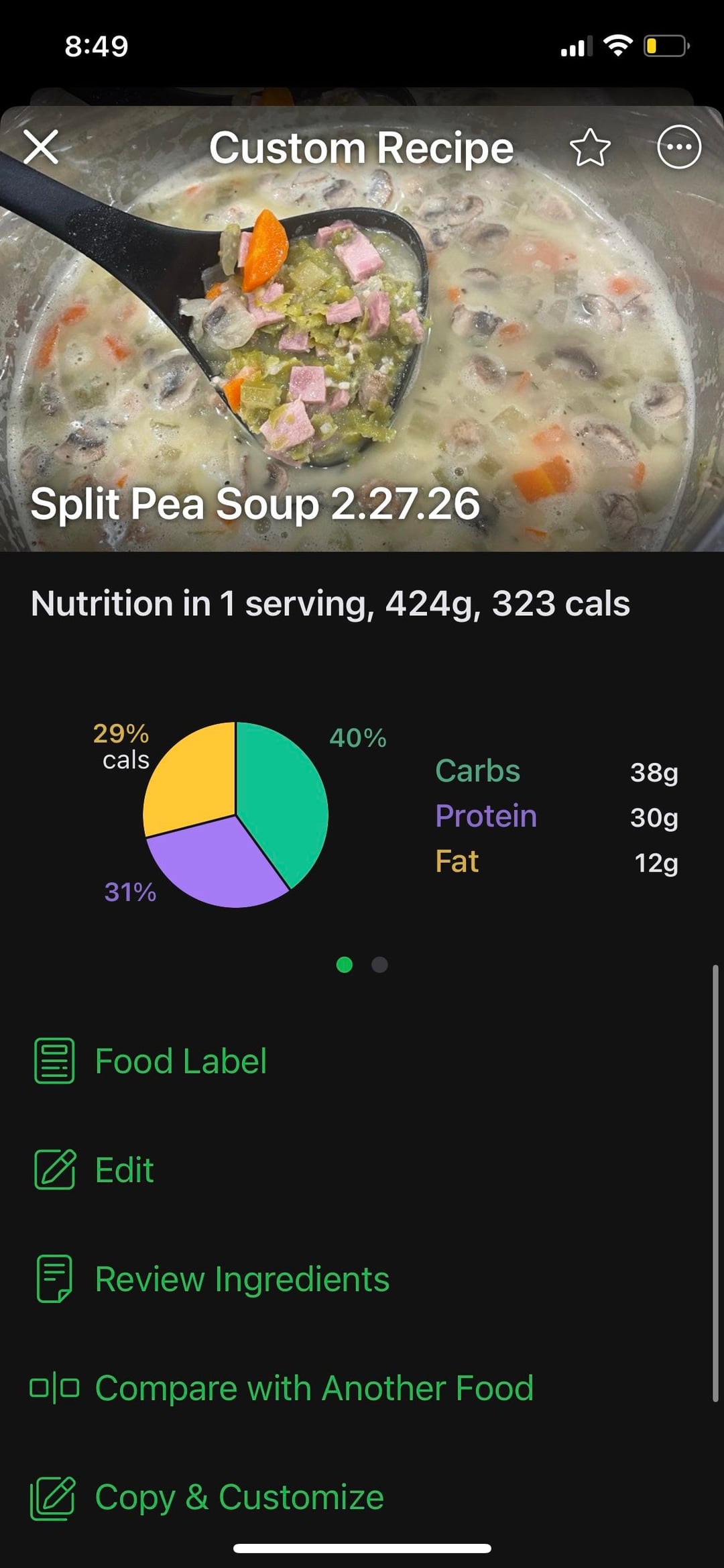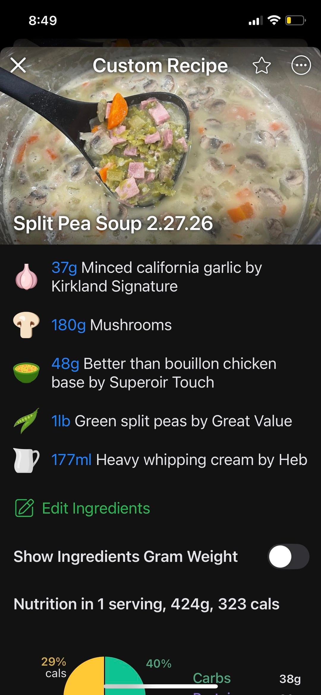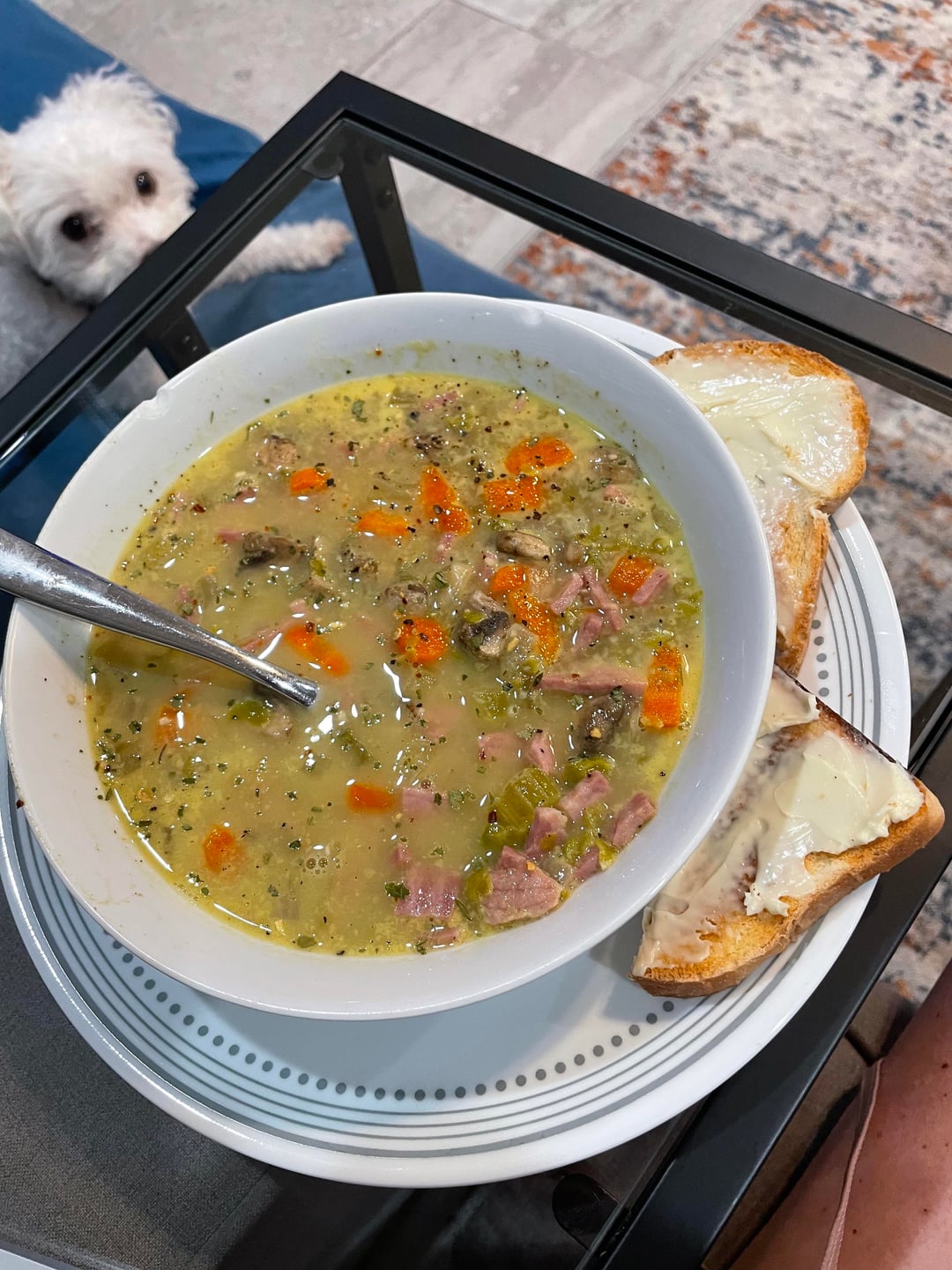 Dinner: Split Pea Soup with toast and a light laughing cow spread.