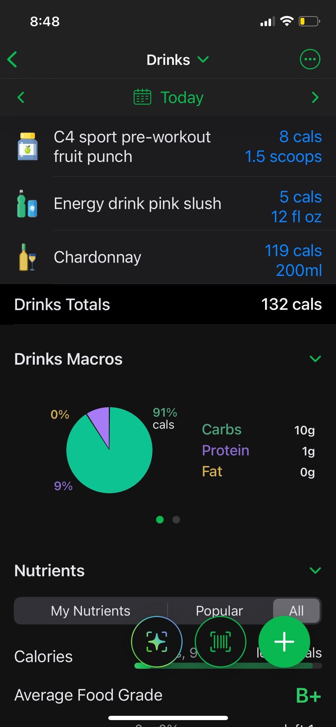 Drinks: Preworkout, Alani, A glass of Chardonnay