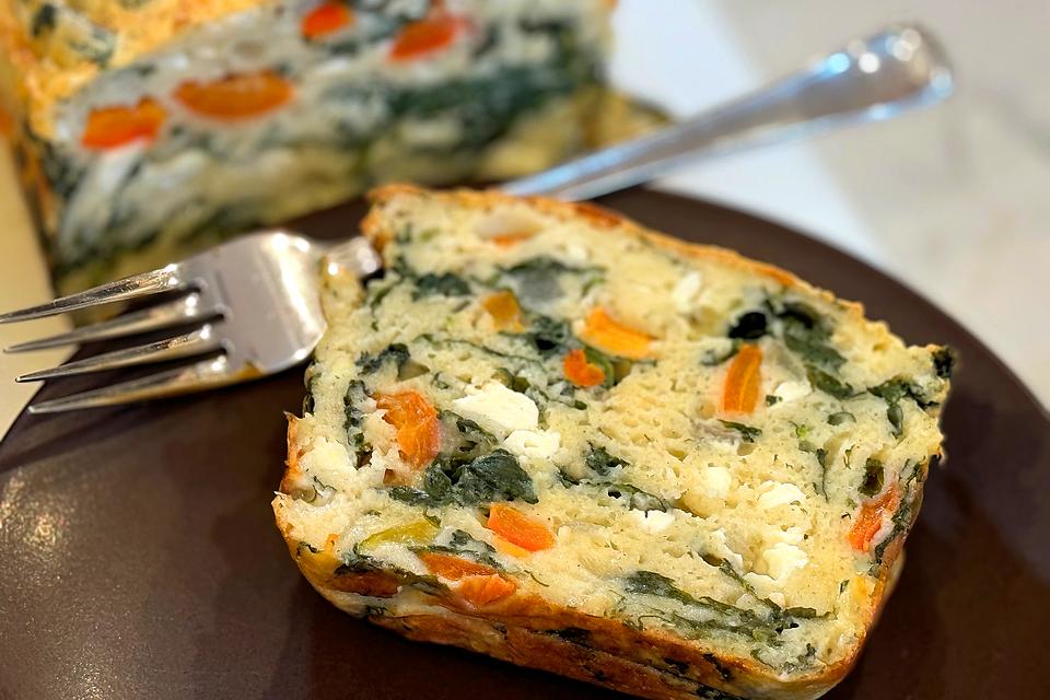 To make this Mediterranean loaf, you’ll need the following ingredients: extra virgin olive oil, fresh spinach, onion, red bell pepper, garlic, eggs, cottage cheese, plain Greek yogurt, flour, baking powder, salt, feta cheese and Parmesan cheese. You sauté the onions, peppers, garlic and spinach before whipping the cottage cheese with the eggs in a blender. Next, you make the batter then bake the loaf until golden.