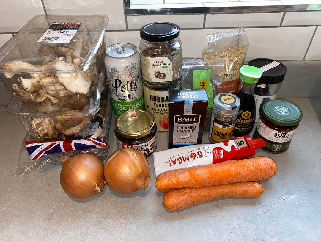 Roughly chop up your mushrooms (dried & fresh) and vegetables (onions, carrots & garlic) then place into side bowls.