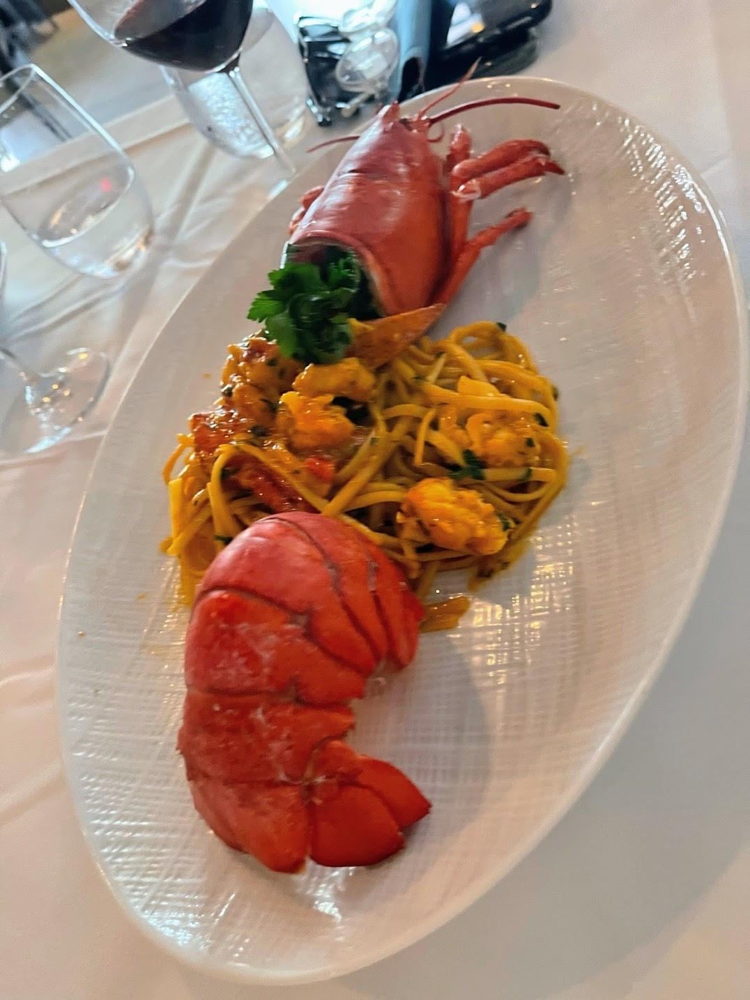 Linguine with a whole lobster tail and claws in a light garlic sauce.