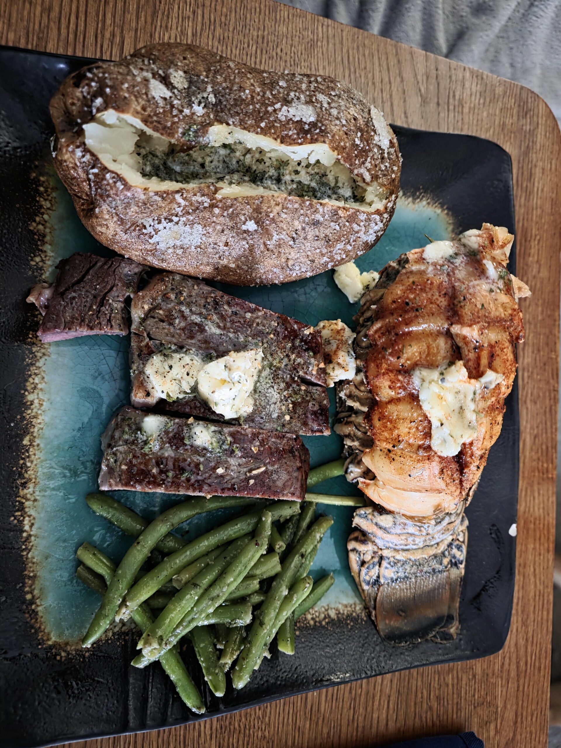 This was my valentine's day dinner for the wife. The lobster tails were cooked sous vide 134f for 45min. Ribeye was cooked reverse sear and smoked with a smoking gun while resting before the sear. The butter was also smoked. Sides of baked potatoes and garlic parm green beans.