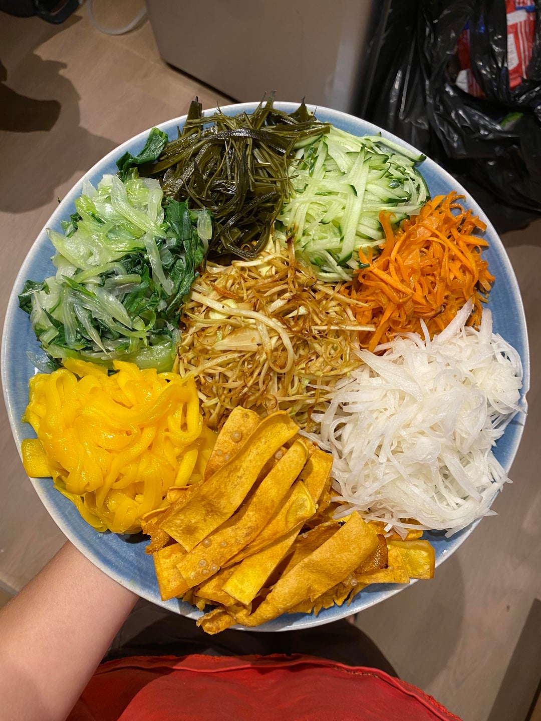 4. Lo hei- chinese new year tradition for everyone to grab chopsticks and toss this salad together 😉 components are relatively up to interpretation as long as it’s in long strands. Here I’ve done nori sheets, cucumber, carrot, pickled radishes, fried wonton strips, mangoes, pak choy, cabbages, lightly sautéed where it makes sense