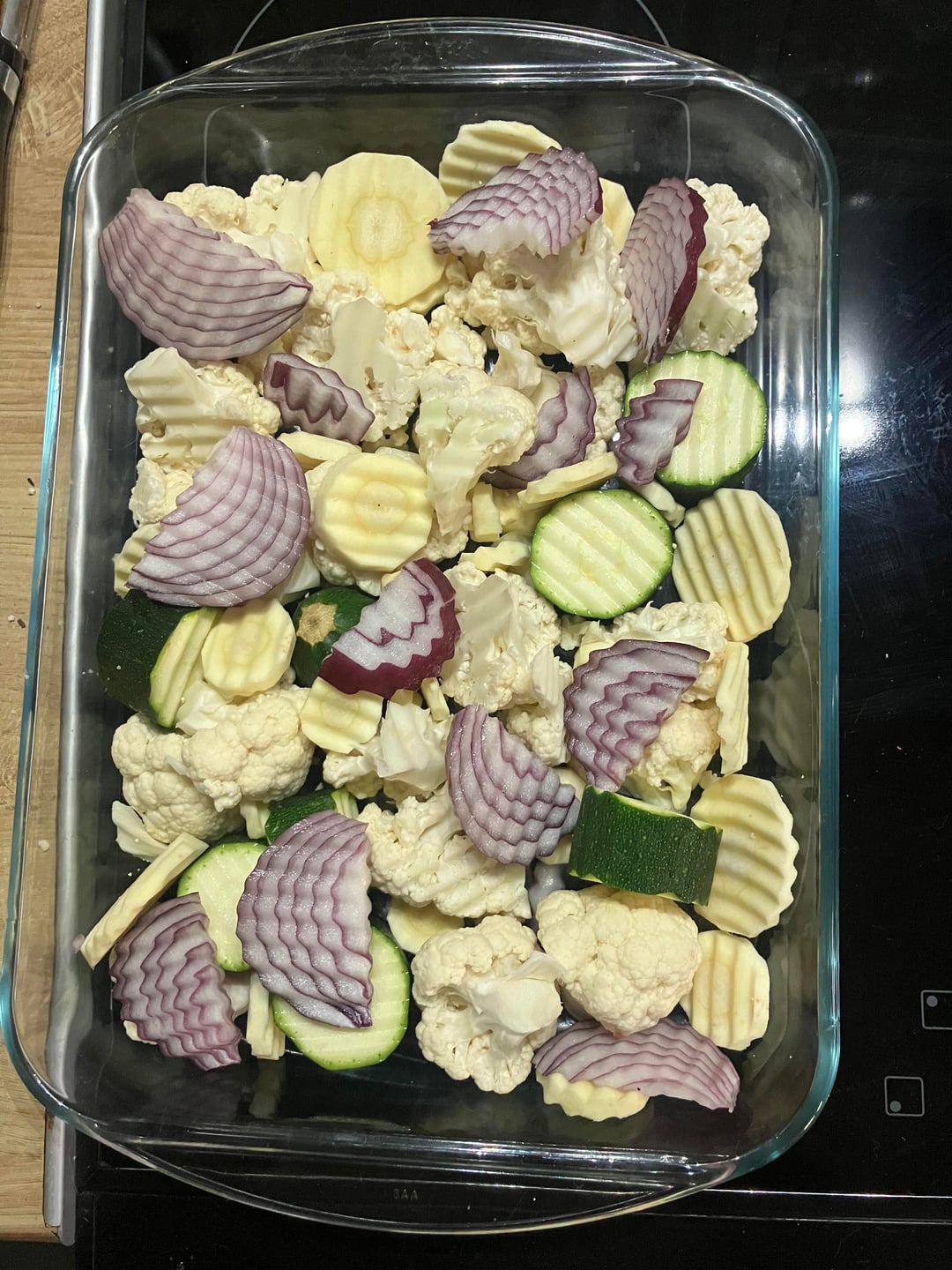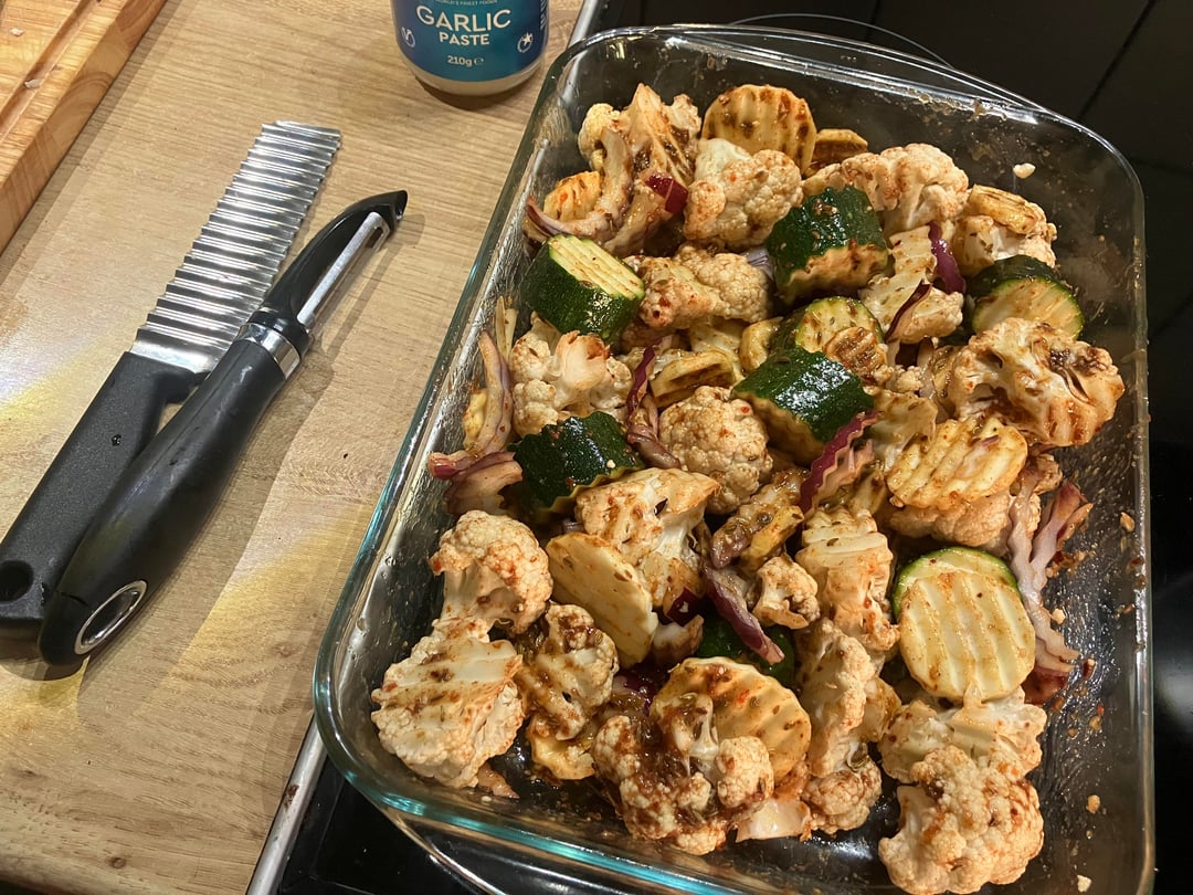 Add the mixture to the tray of veggies and stir well to coat everything nicely.