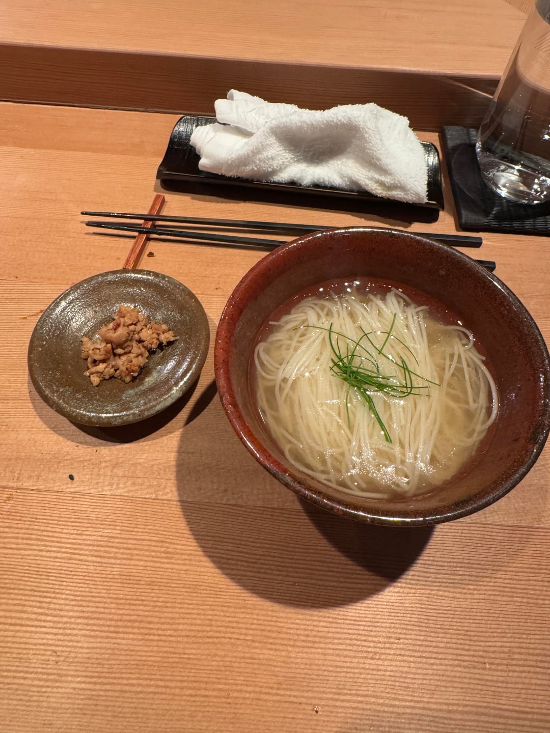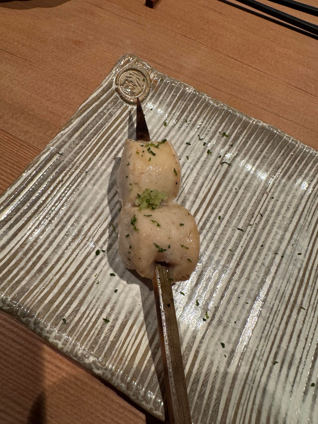 The restaurant is unmarked in an assuming spot. When you enter, the space is beautiful with seating surrounded the yakitori grill. The restaurant seats maybe 10-12 guests. They get right into it and scent of charcoal grilling completely fills the spot. There is tons of smoke but the ventilation system does incredibly well to keep it out of the dining area.
