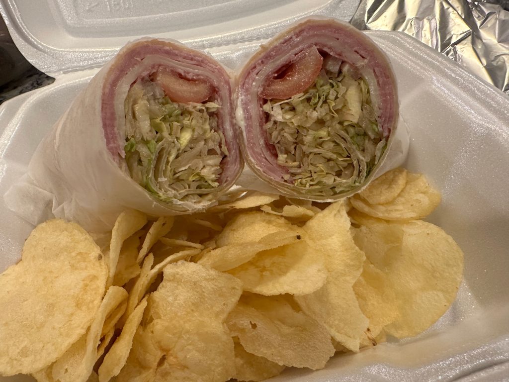 Julie decided on something simple — a hoagie wrap — which came with a side of chips. (Fries were available for a $1 upcharge). She enjoyed it, getting the essence of the Italian sandwich with the lighter wrap instead of a roll. And she set her chips aside for later so she could enjoy some fries with us.