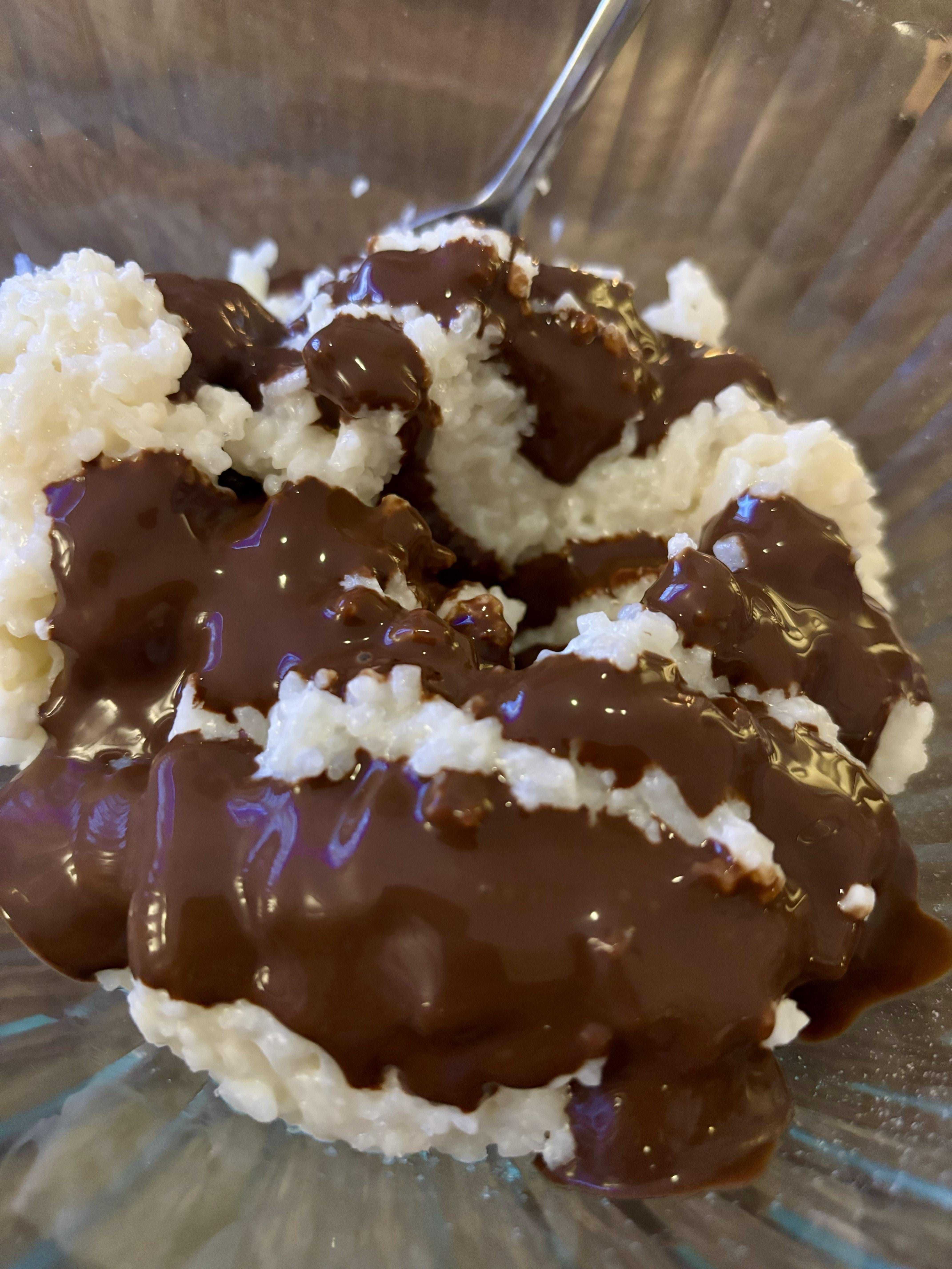 I use a package of uncle Ben’s coconut jasmine rice, one cup of milk, two packets of Splenda and 1/3 stick of butter with a few grinds of sea salt. All that is simmered+stirred in a pan for about 5 to 8 minutes on medium to low heat until thickened. After it has thickened and sat for a few minutes on top of the stove off the heat, I put it into a dessert bowl and top it with chocolate syrup. Not too much but enough for it to seep into the pudding a little bit. It really tastes like a mounds candy bar. Phenomenally indulgent, low effort.