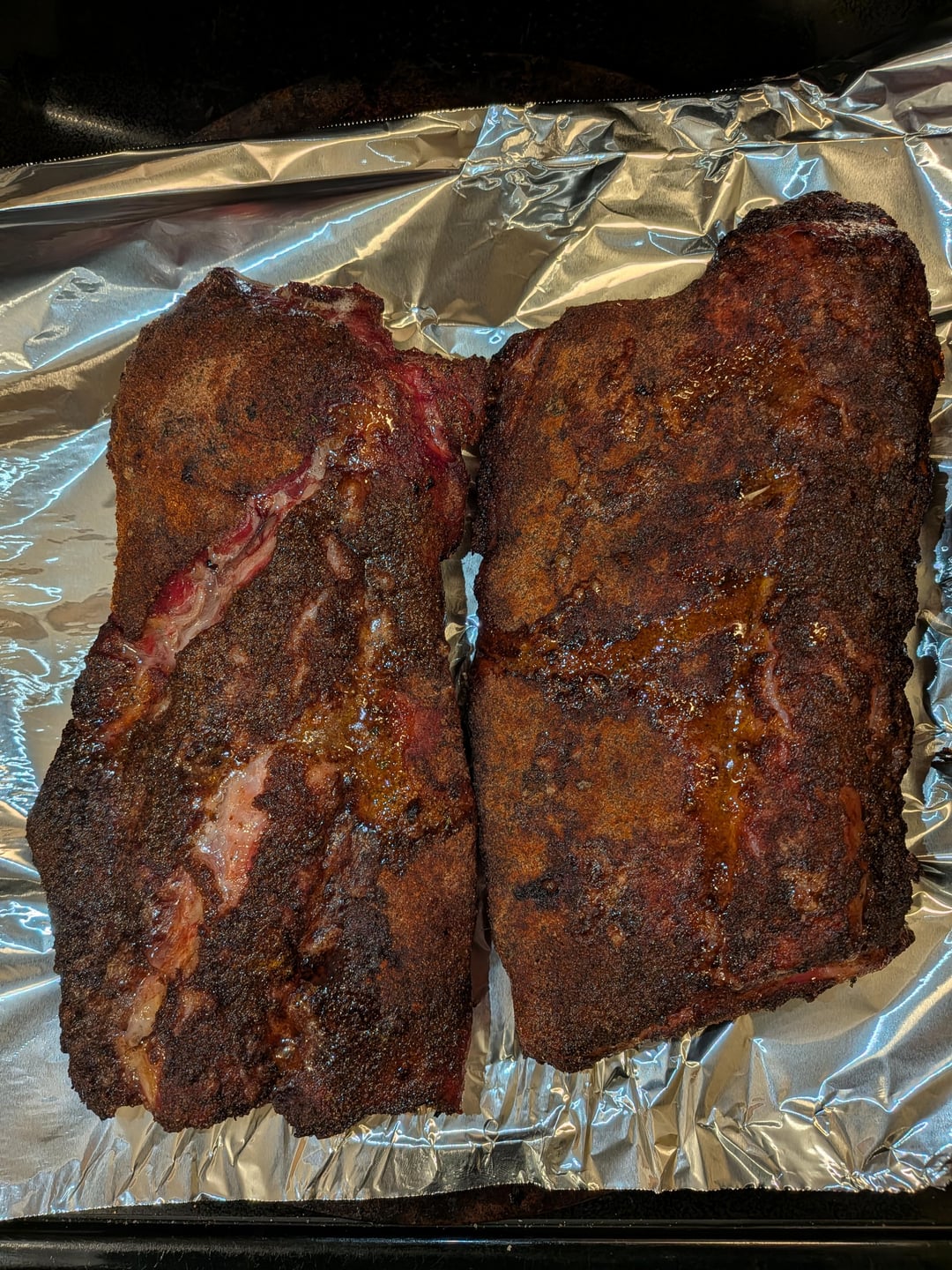 Started them later in the day than I wanted, last minute idea. Did 275f for 3 hours, foil wrapped with butter, honey and some water for 45m in the oven at 275 and sauced em. BBQ sauce locally made.