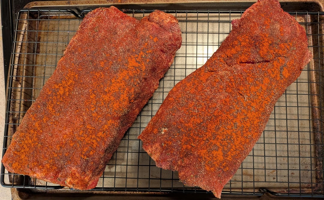 Light coating of soy sauce as the binder, smoked salt, black garlic, black pepper, onion powder and smoked paprika for my seasoning, let it set 3 hours before cooking.