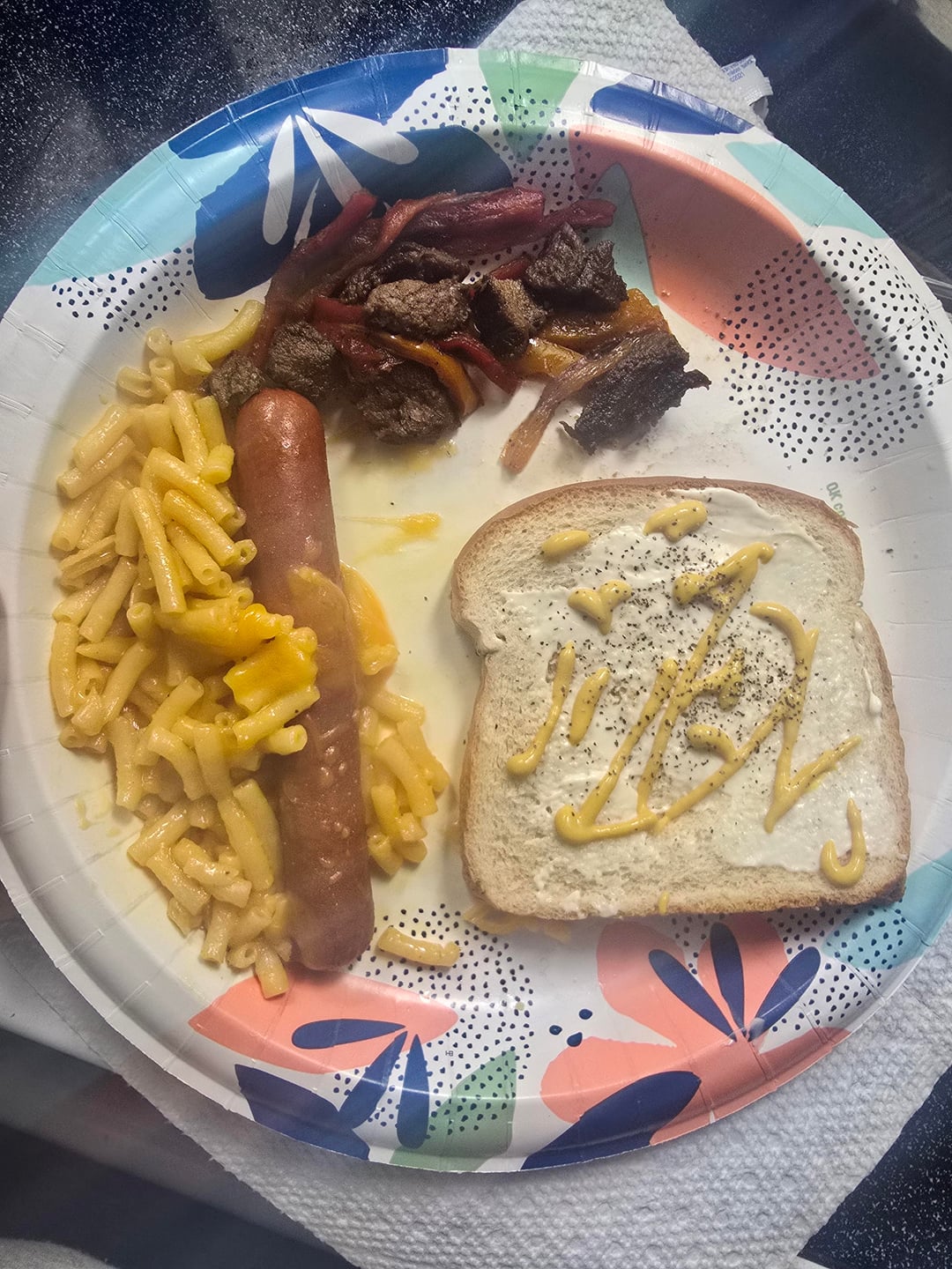 I'm day drinking with a hot dog, Kraft Mac, steak & peppers. All on a bed of Wonder bread slathered in mayo, mustard, and pepper. (I'm taking a break from my Yuengling because my palate needs a break so I got busch(water) instead)