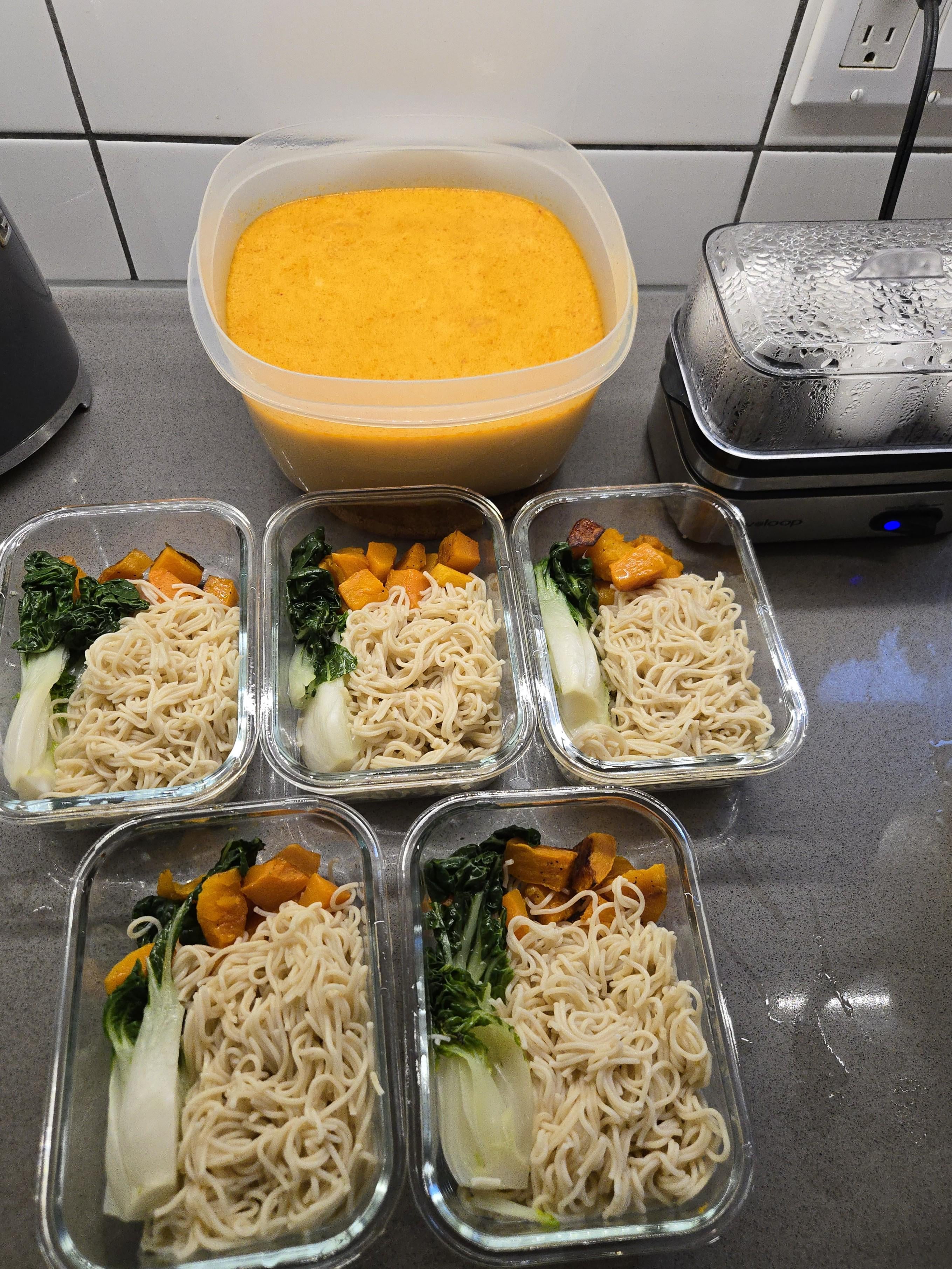 Red curry ramen is such a good call for meal prep. The broth actually gets better after sitting in the fridge for a day or two because the flavors keep developing. Butternut squash in there is smart too, holds up way better than something like zucchini that gets mushy by day 3.