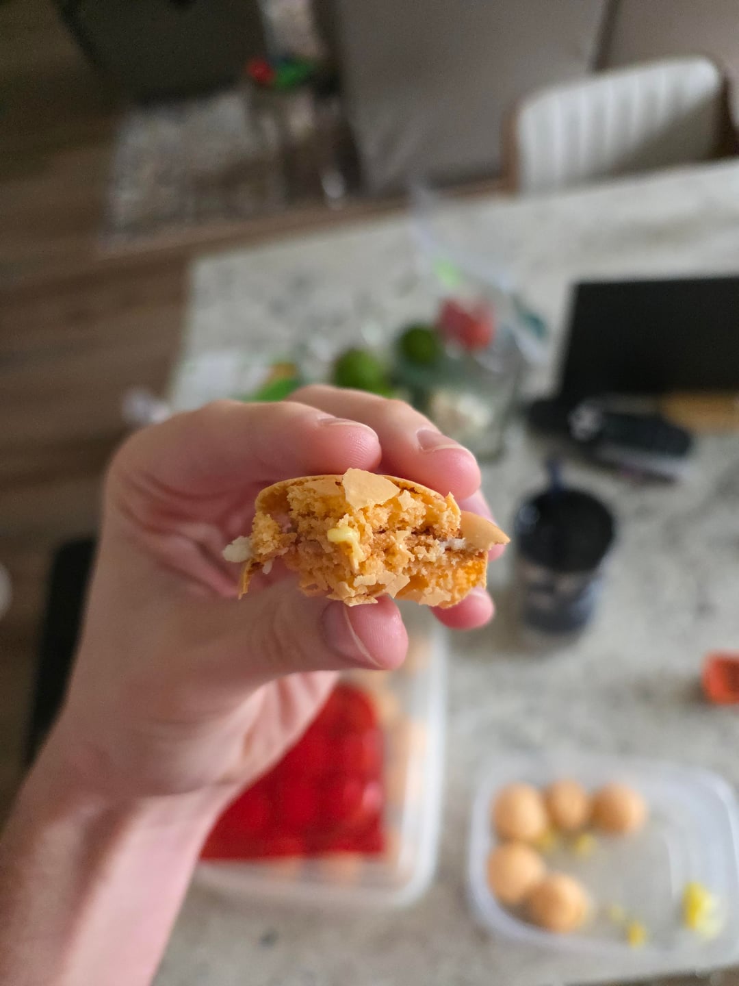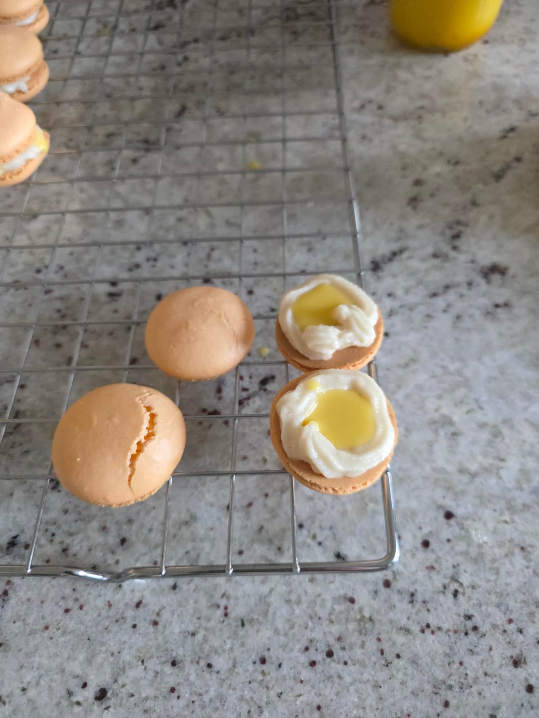 Orange flavored macaron cookies with a vanilla buttercream frosting and an orange curd center 🙂