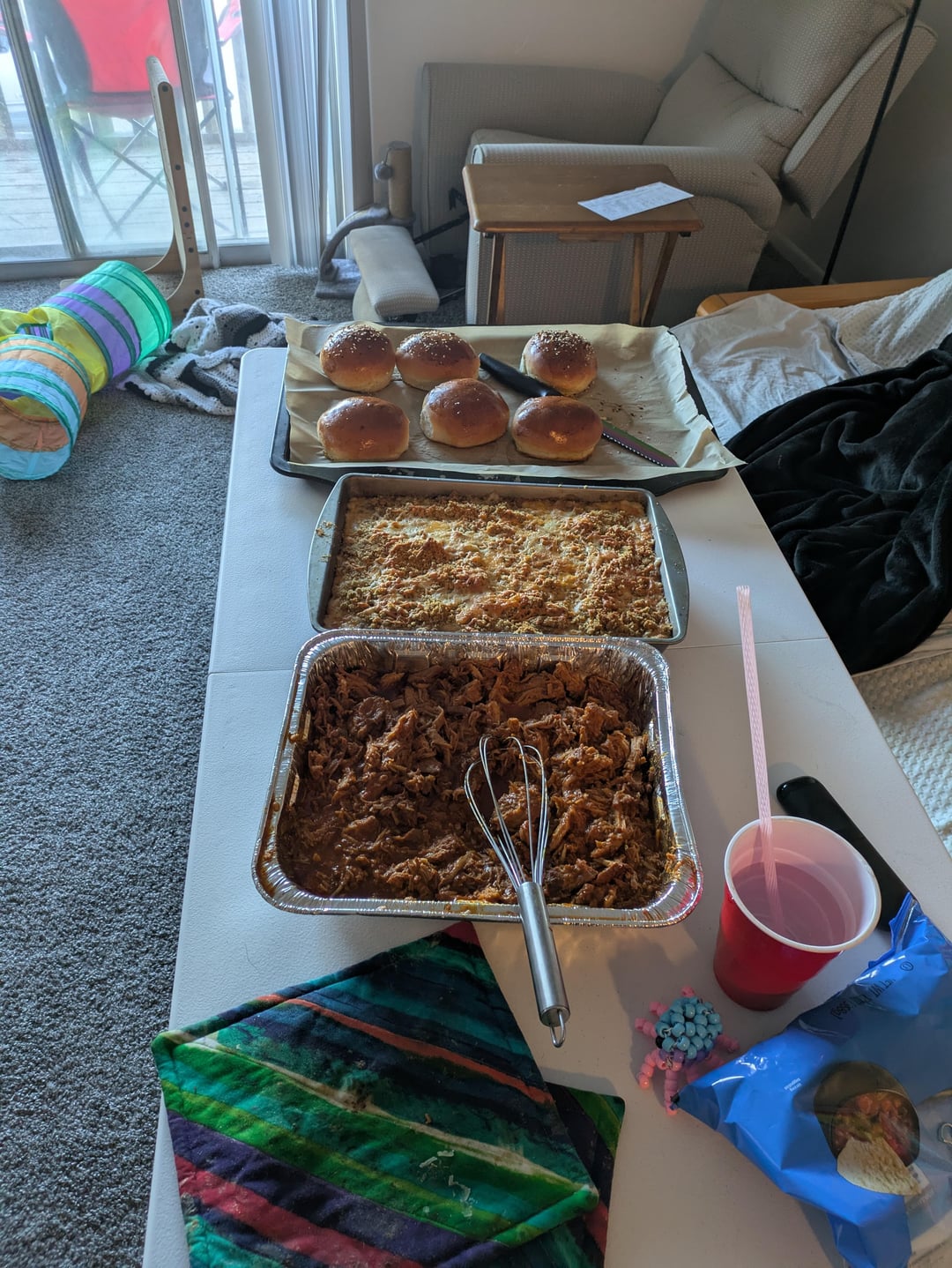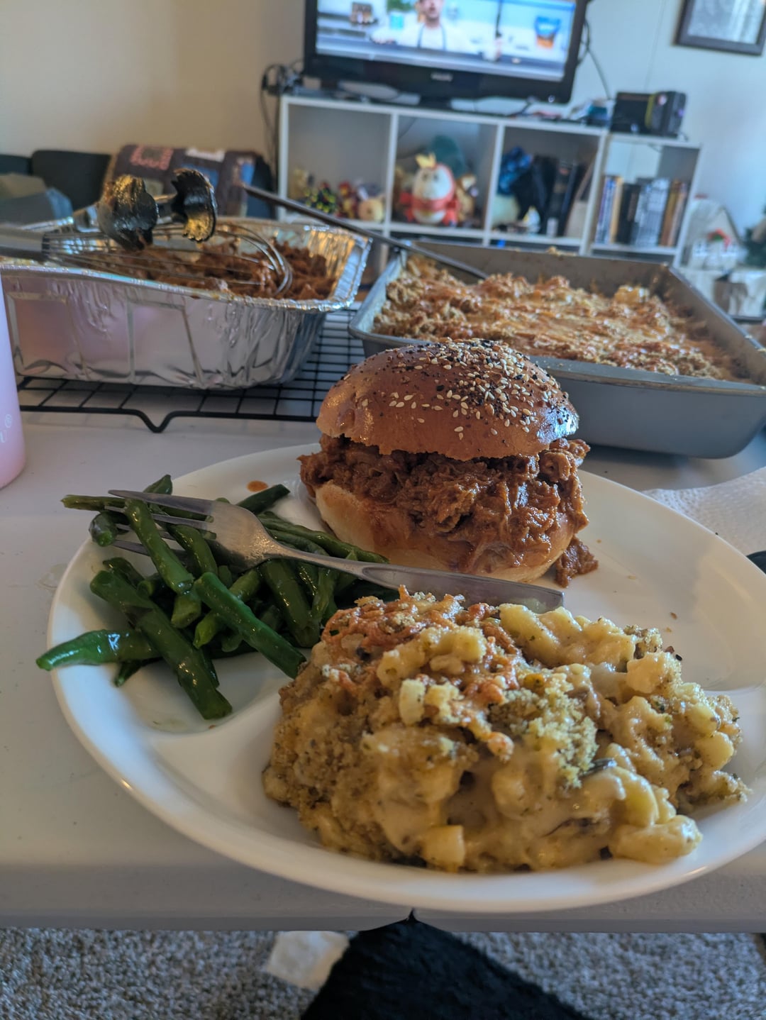 Pictured is homemade buns, oven pulled pork with homemade BBQ sauce, lactose free baked Mac n cheese, and green beans! made for my partners birthday!