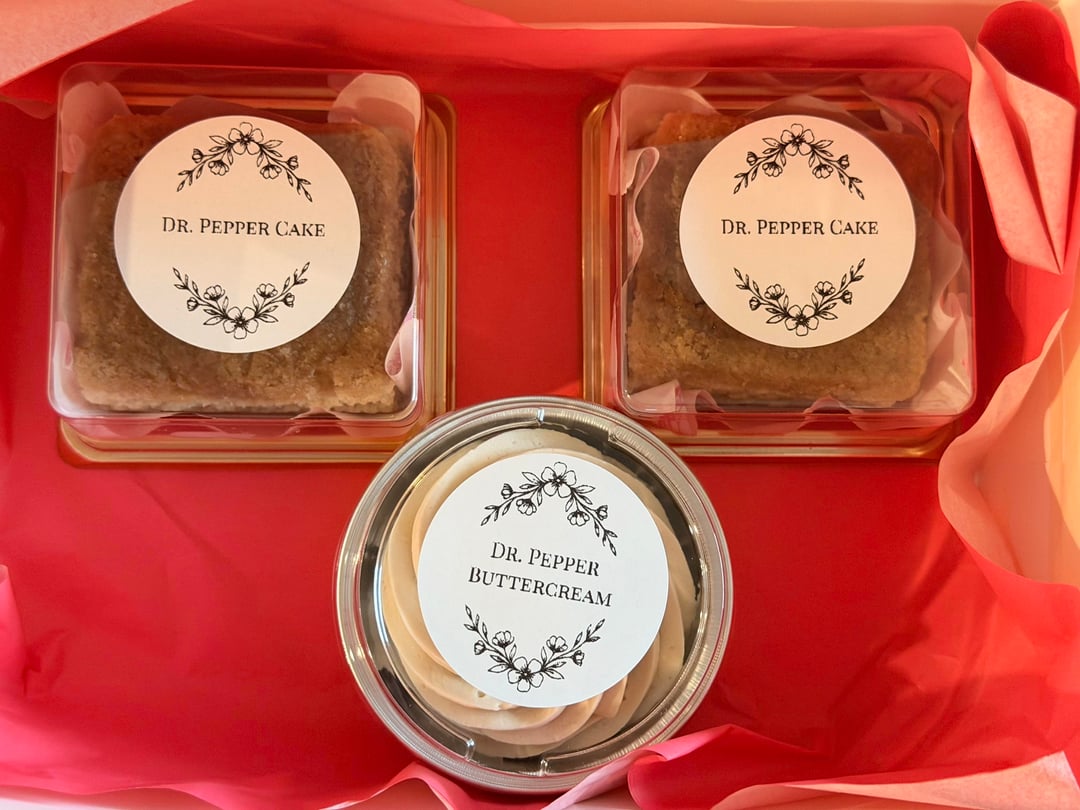 Second wedding cake tasting box just got dropped off! I decided as a surprise to include Dr. Pepper flavored cake and buttercream since the bride-to-be told me that she and her fiancΓ© love Dr. Pepper! Itβs dark on top of the cake because I also brushed it with Dr. Pepper syrup at the end.