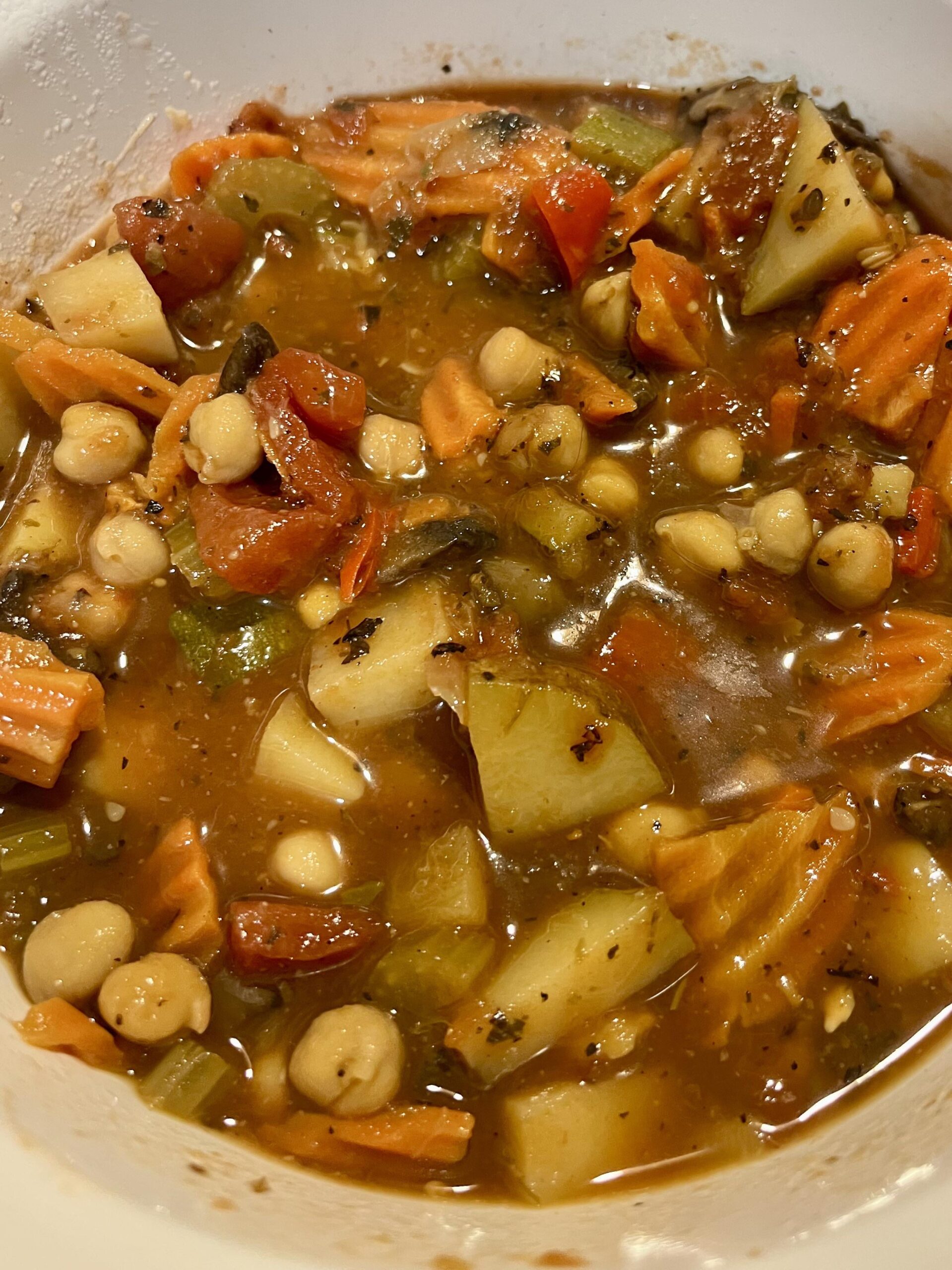 This was SO good. Even my kids who are very picky and not vegan loved it. I used: russet potatoes, tomatoes, mushrooms, zucchini, onion, red pepper, carrots, celery, canned chickpeas and vegetable broth, italian seasoning, and coconut aminos. It was so flavorful and delicious! And extremely easy!