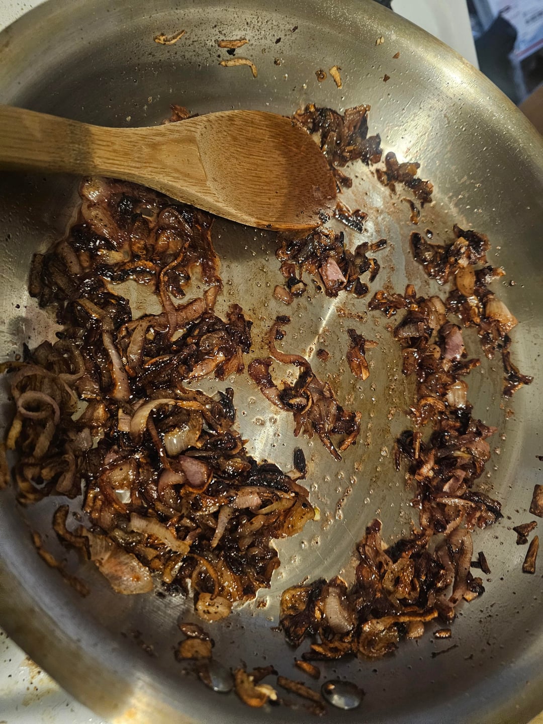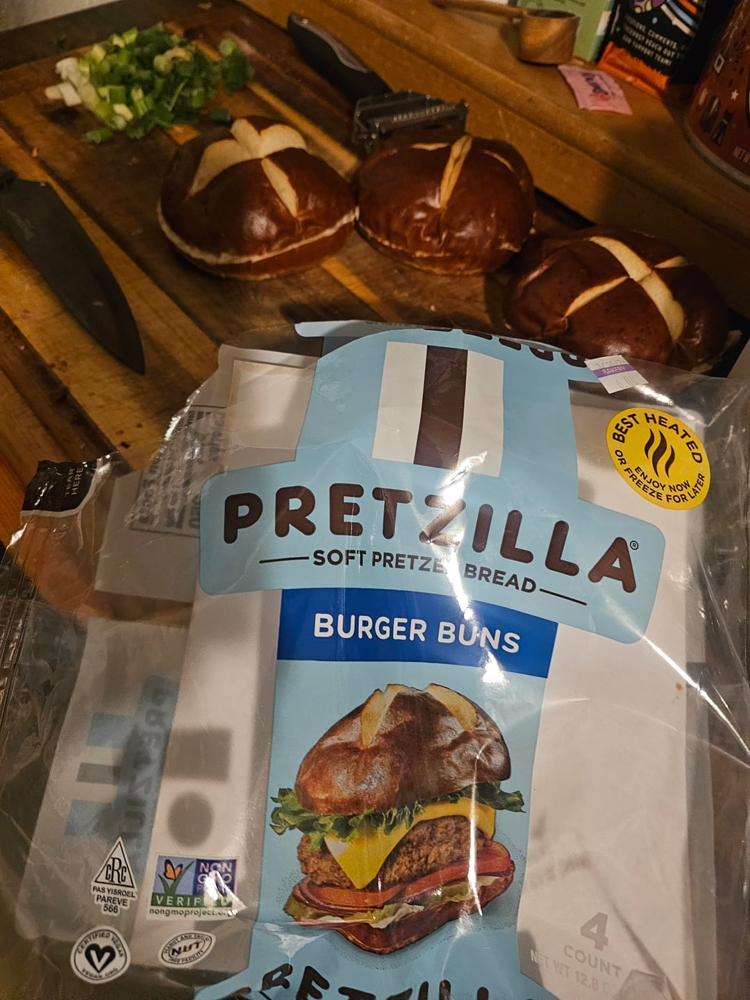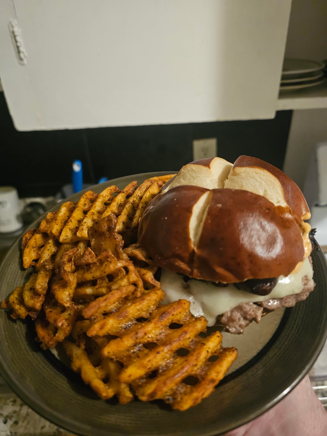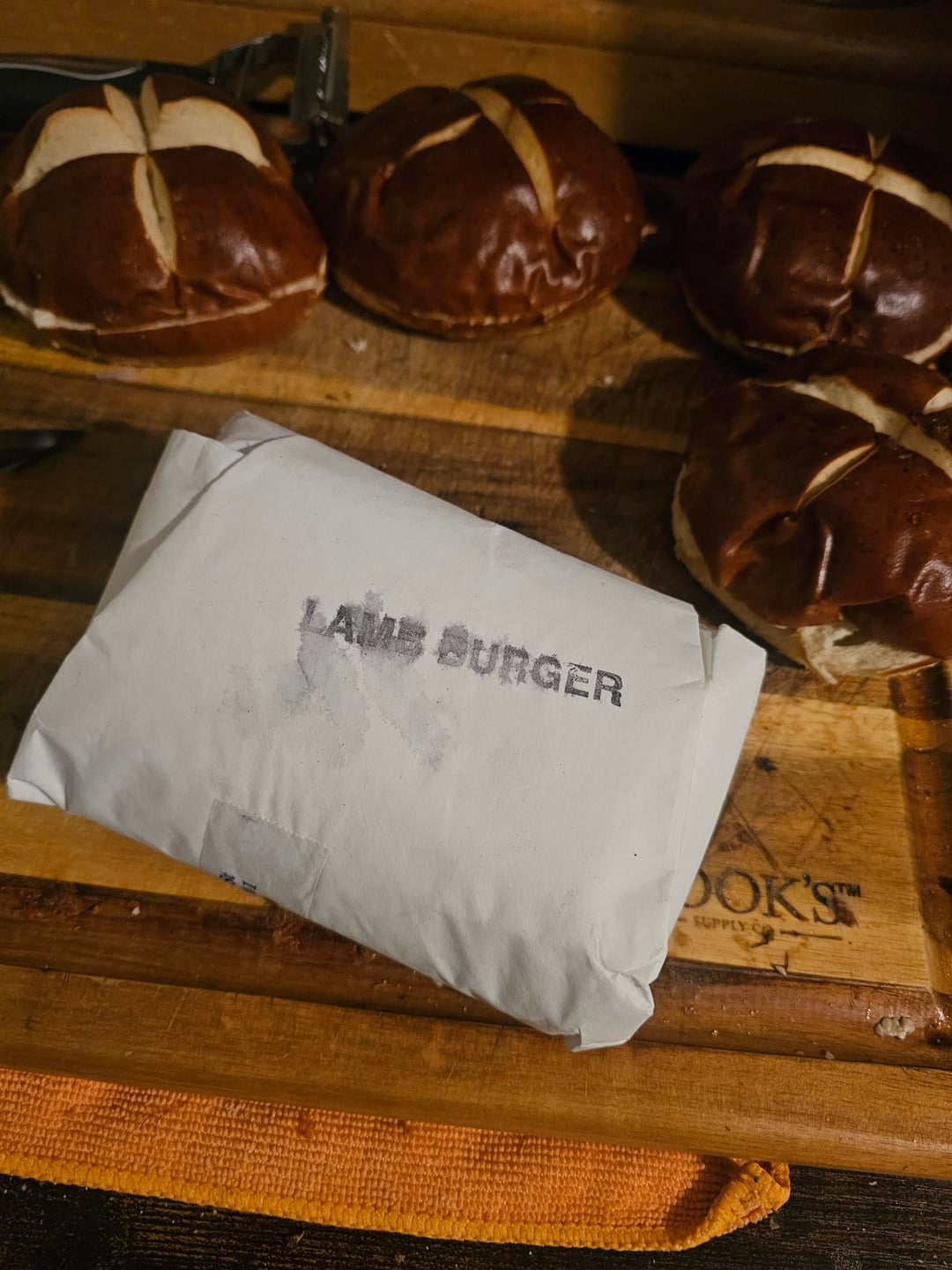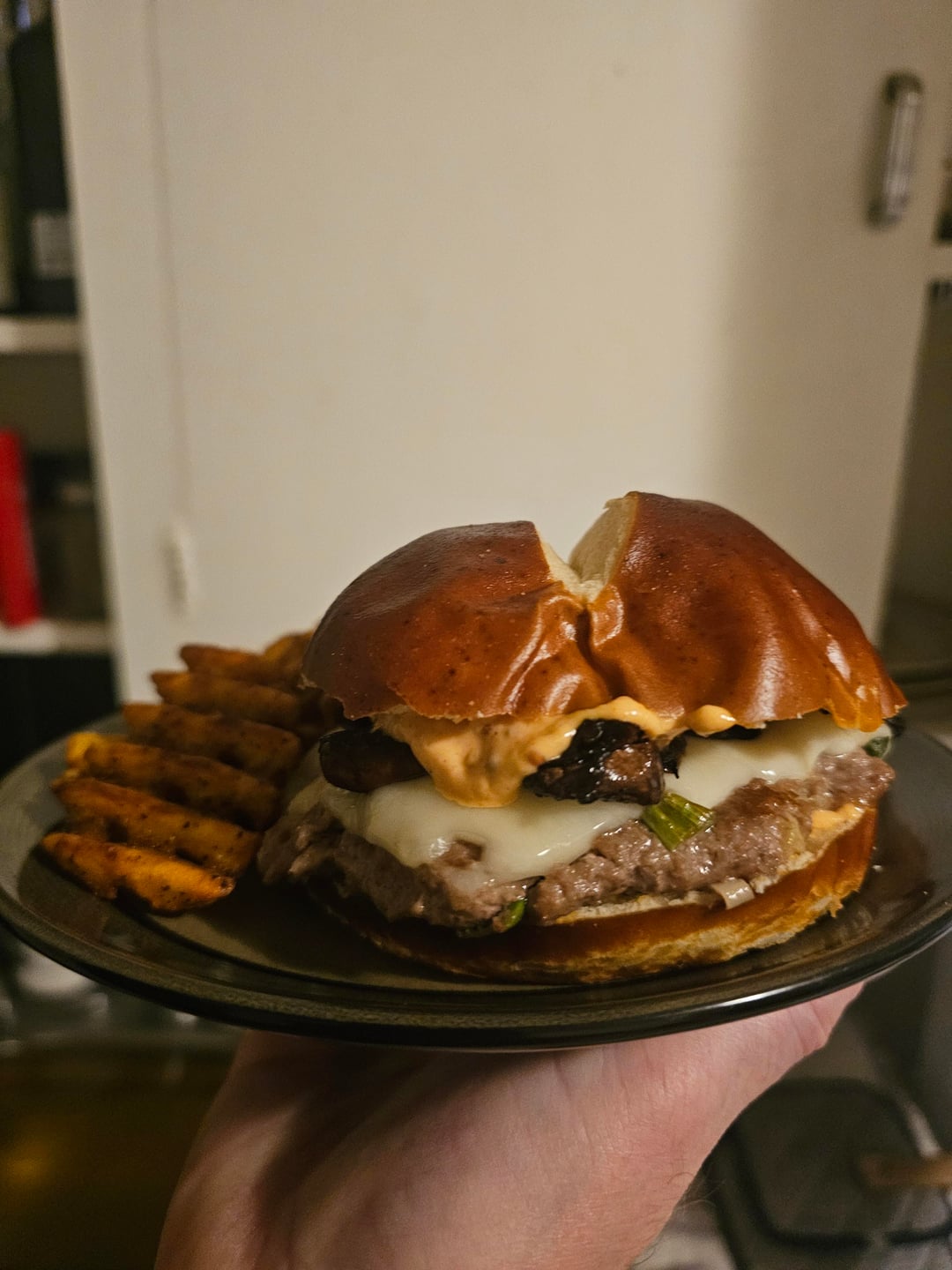 Caramelized shallots and cremini mushrooms on a lamb patty with Swiss cheese and a pretzel buns.