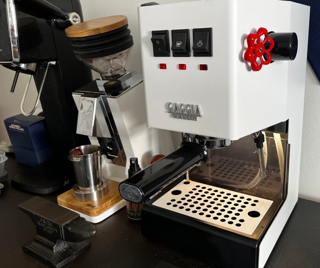 Recently upgraded from my lightly modified (opv, vinyl cover, flow control, led) Gaggia to a Mechanika Max. My Gaggia earned the name Gandalf the White after I covered the scratched gray brushed steel surfaces with white vinyl. Gandalf the White has retired. Long live Silver Surfer.