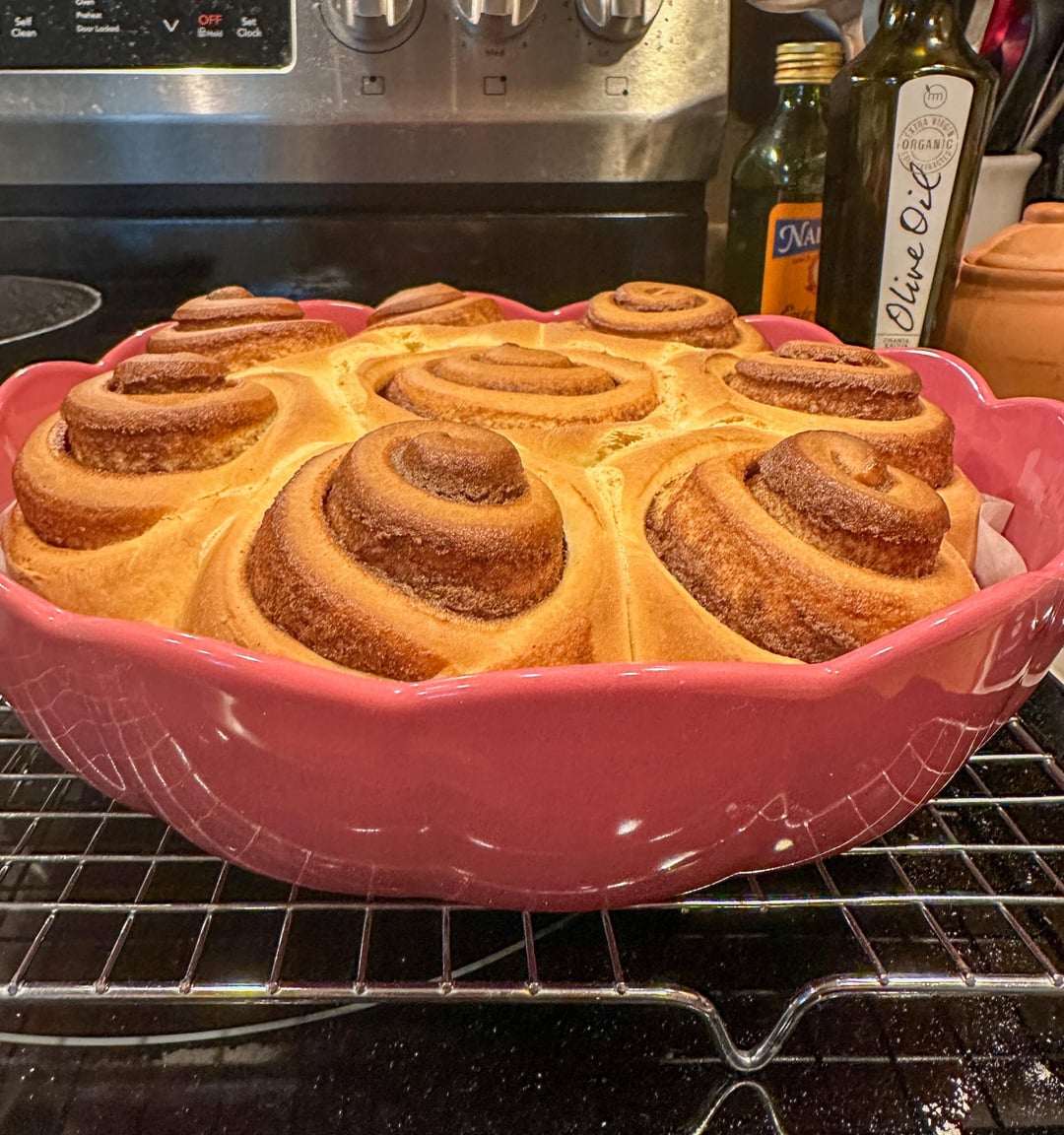 That baking dish is beautiful and your cinnamon rolls look delicious!