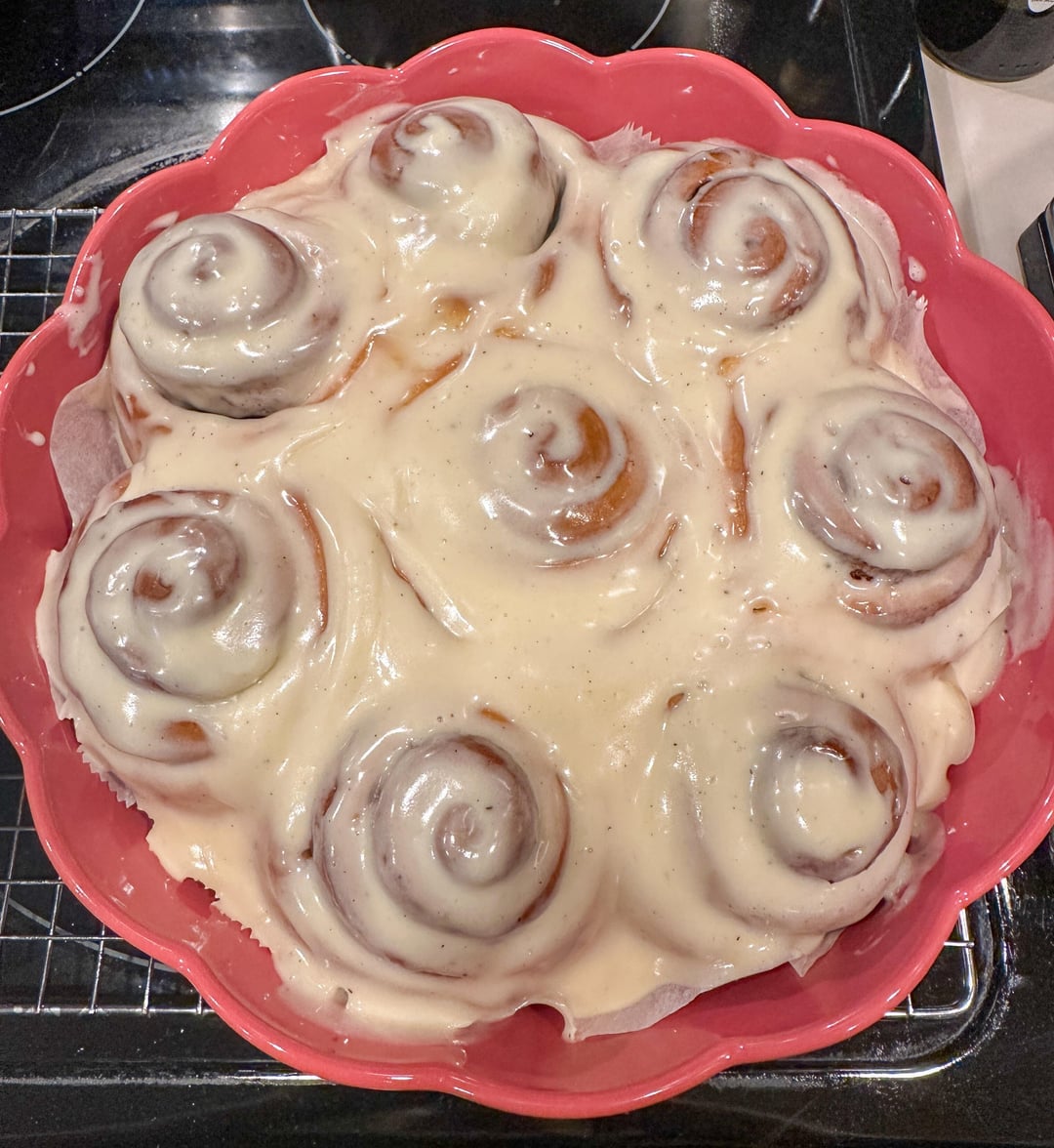 Cute dish that’s holding the perfect cinnamon rolls! Perfect amount of icing too!