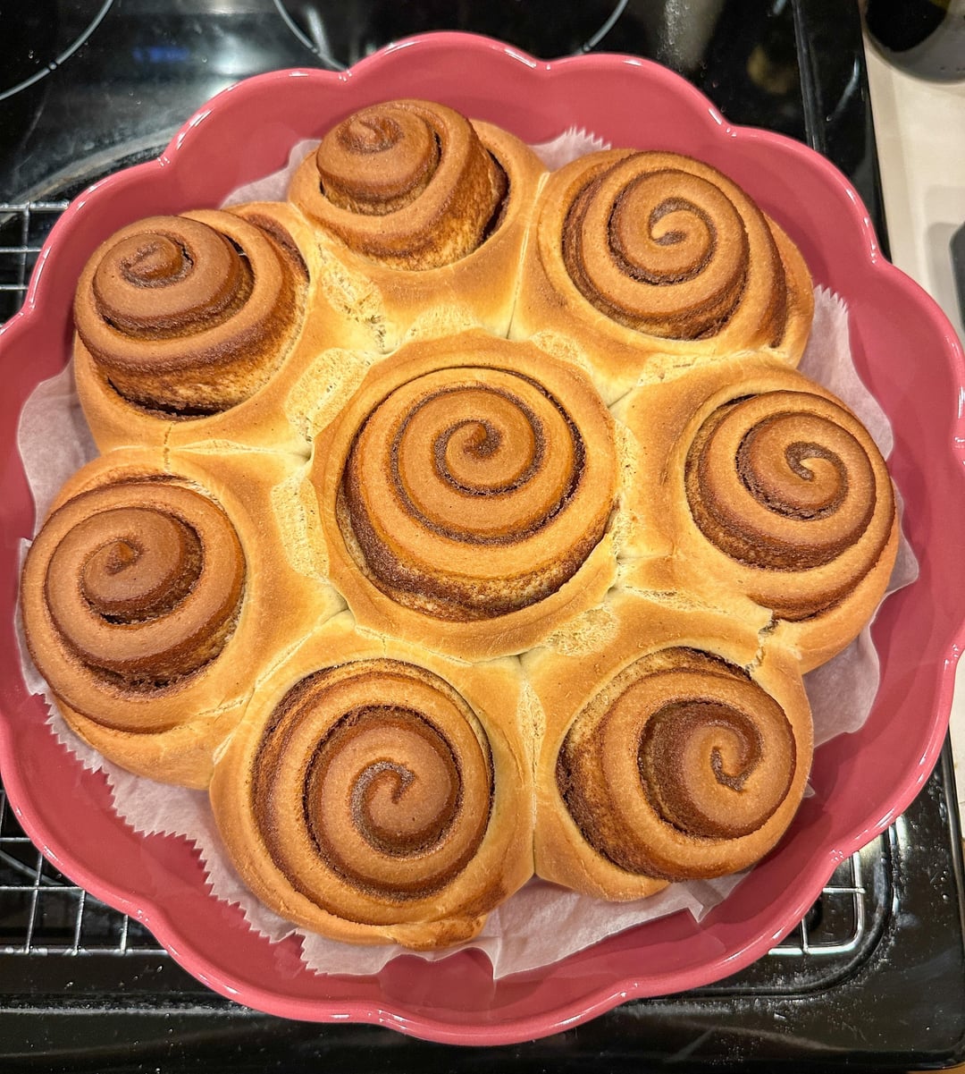 These are my fave cinnamon roll recipe – Cloudy Kitchen’s brown butter cinnamon rolls, except I am lazy so I don’t brown the butter, and I use the King Arthur cinnamon filling (because: lazy).